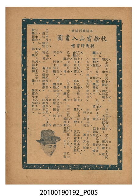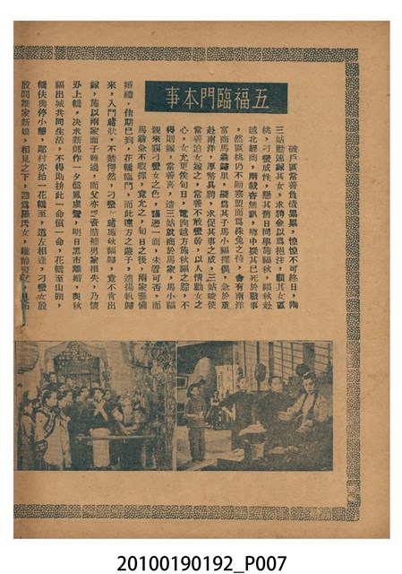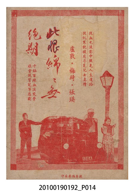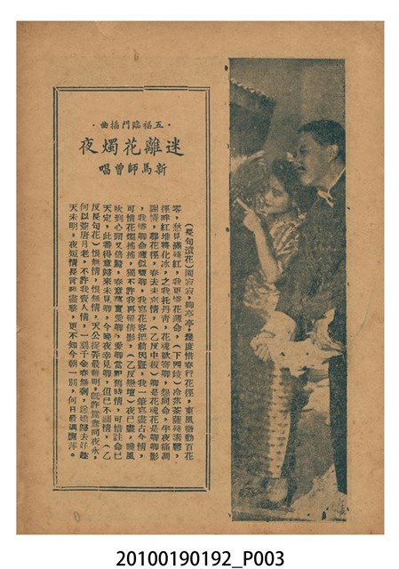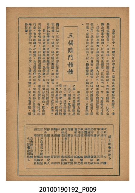 1. 香港電影《五福臨門》於越南戲院上映時的電影本事小冊。彩色的封面印有片名「五福臨門」,標明「別開生面 奇情香艷 狂笑諷刺 歌唱喜劇」廣告文字,並列出主演演員名單及「任護花編導」。男女主角的劇照人像佔有一半版面。本事封底為電影廣告,介紹粵語片《此恨綿綿無絕期》。2. 香港電影《五福臨門》為永聯影業公司於1950年出品的粵語時裝喜劇片,由任護花編導,新馬師曾、紫葡萄、羅艷卿、伊秋水、鄧寄塵等領銜主演。本片主角之一的鄧寄塵於1949年加盟英國「麗的呼聲」(香港分公司)廣播電台,擅長模仿不同的聲音及演出詼諧,有「播音皇帝」、「諧劇大王」、「天空才子」之美譽。