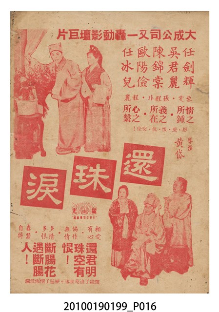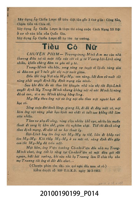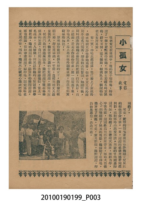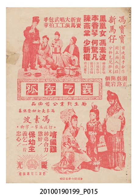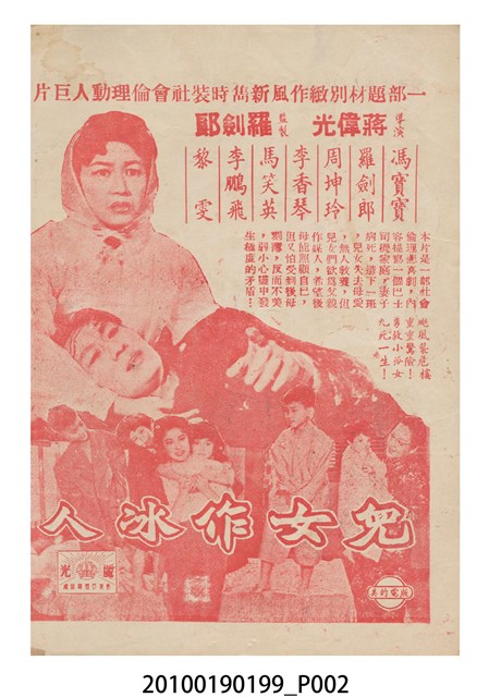 1. 香港電影《小孤女》於越南戲院上映時的電影本事。雙色的封面印有片名「小孤女」,角色群像佔有一半版面。本事封底為電影廣告,介紹粵語片《還珠淚》;本事內頁則為《兒女作冰人》、《義乞存孤》的電影廣告。2. 香港電影《小孤女》為寶峯影業公司於1961年出品的粵語時裝文藝片,由馮峰編導,馮寶寶 、小燕飛、胡楓、林坤山等領銜主演。本片為寶峯影業公司創業作,獲得1961年由香港商業電台、《工商晚報》和《亞洲畫報》聯合舉辦的 「十大最受歡迎國、粵語片」獲選影片之一,亦是主演之一小燕飛旅美四年回港首作。小燕飛為著名的1940-50年代伶影雙棲的粵語明星,1952年她有感於粵語片素質參差,便與多位影人合股成立「中聯電影企業有限公司」,中聯時期演出作品包含《苦海明燈》(1953)、《金蘭姊妹》(1954)、《烽火佳人》(1958)等,1961年她拍畢《小孤女》與《紐約唐人街碎屍案》後退休,移民美國。
