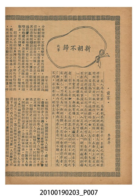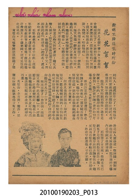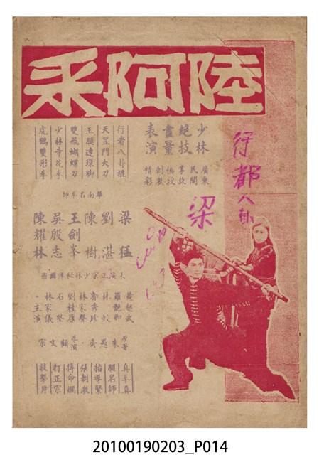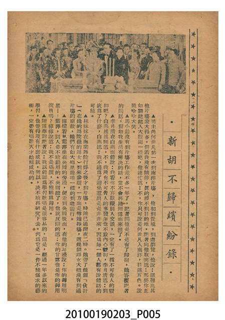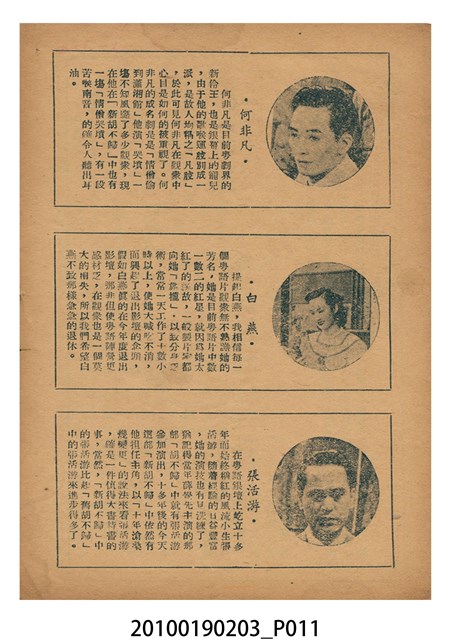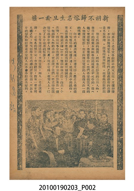 1. 香港粵語片《新胡不歸》等片宣傳小冊,封面由劇照和彩色插圖構成,並標明「新胡不歸」字樣,封底則為《陸阿采》(1950)的廣告,內頁包括《新胡不歸》的電影故事、曲詞、演員介紹、花絮。2. 《新胡不歸》為1951年由香港新華僑影片公司出品,吳回導演,白燕、張活游、何非凡、小燕飛、林妹妹、黃楚山、陳露華、葉萍等人主演的時裝香港粵語片,描述建築家孔翁的繼室二娘生性悍妒,生子紹強及女紹蘭後,更視嫡子紹剛如眼中釘。紹剛頗有才幹,深得弟妹愛戴,與女友劉玉英感情甚篤。而紹強與女工馮慧茹亦愛苗日茁,慧茹更珠胎暗結。然二娘貪圖劉家財勢,顛倒姻緣的故事。