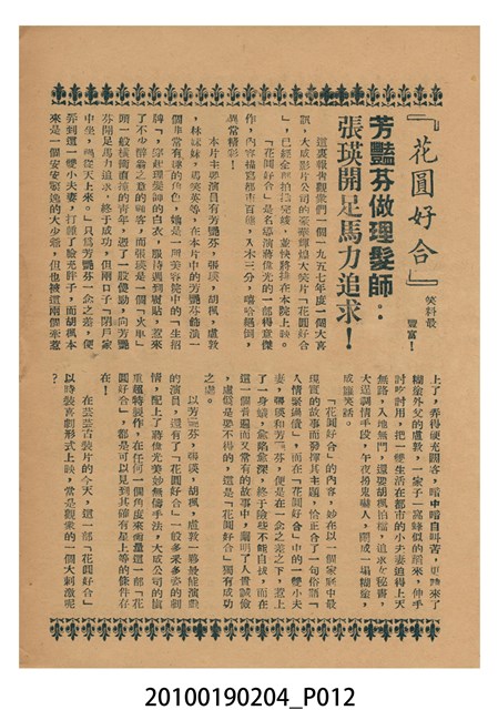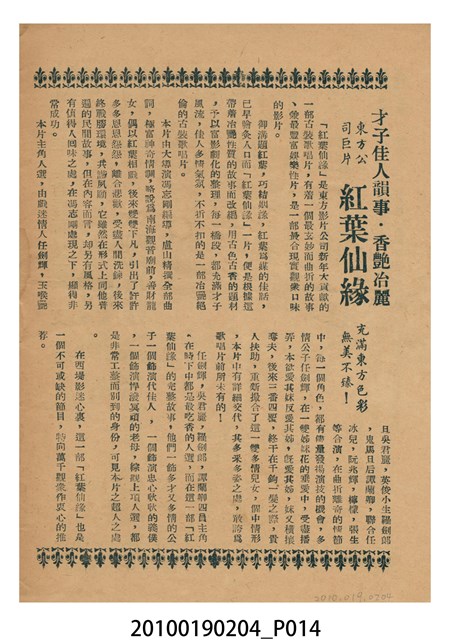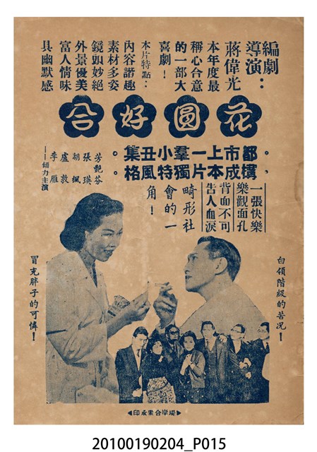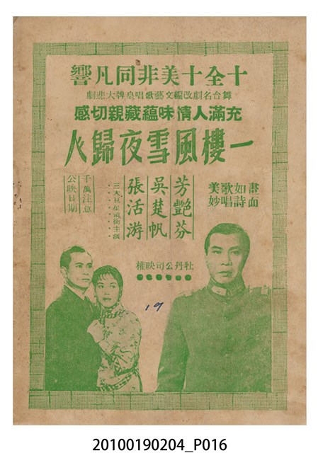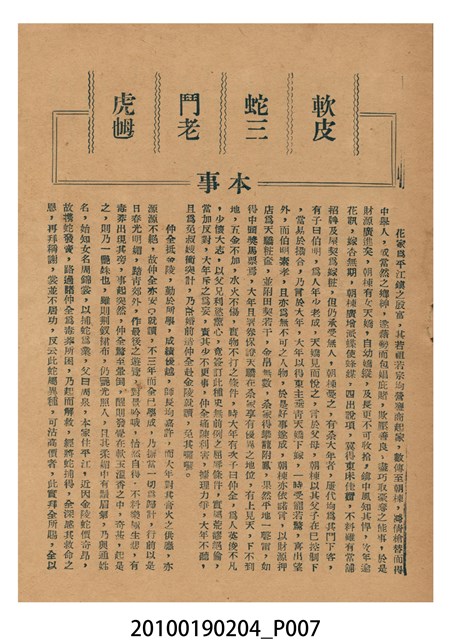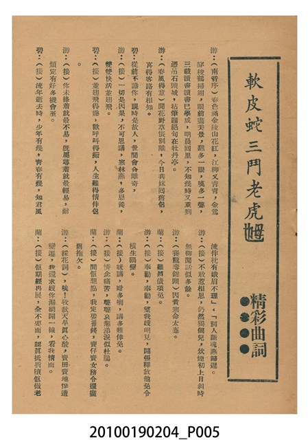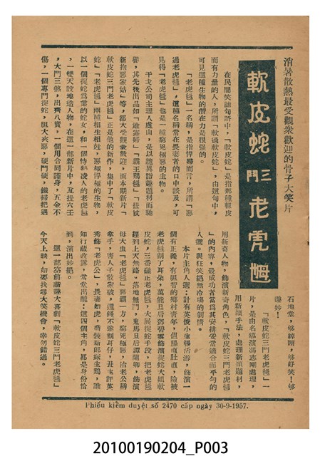 1. 香港粵語片《軟皮蛇三鬥老虎乸》等片宣傳小冊,封面由頭像劇照與彩色插圖構成,並標明「軟皮蛇三鬥老虎乸」與主演演員及導演字樣,封底則為《一樓風雪夜歸人》(1957)的廣告,內頁包括《軟皮蛇三鬥老虎乸》的電影故事、曲詞、演員表,以及《花圓好合》(1957)、《六渡何仙姑》(1957)、《富貴花開艷陽紅》(1957)等電影廣告。2. 《軟皮蛇三鬥老虎乸》為1957年由香港干戈影業公司出品,馮志剛導演,鄧碧雲、譚蘭卿、張活游、許英秀、西瓜刨、周吉等人主演的民初香港粵語片,描述佘仲全返家途中巧遇捕蛇女周錦嫦,兩相投契,佘仲全兄娶妻花千嬌 ,橫蠻霸道、欺負翁姑,在周錦嫦穿針引線下,佘仲全決定收購茶樓自力更生,花千嬌多番留難,最終為懸官懲戒的故事。