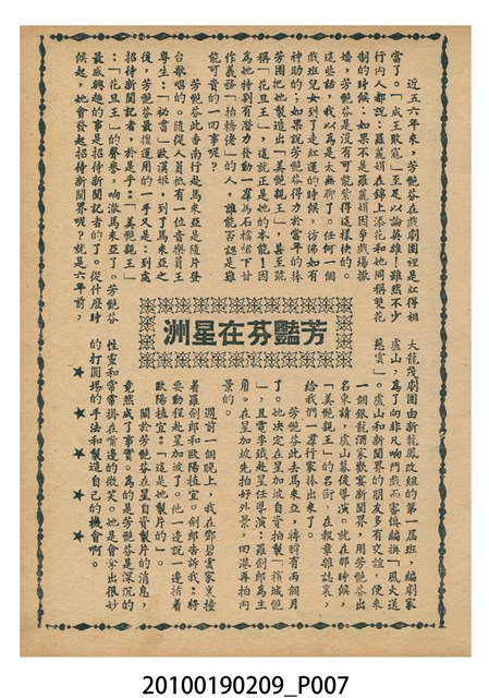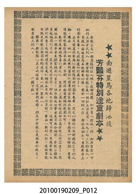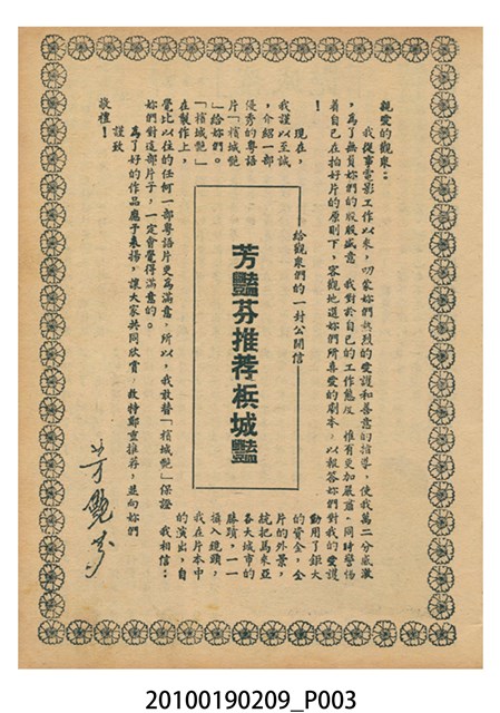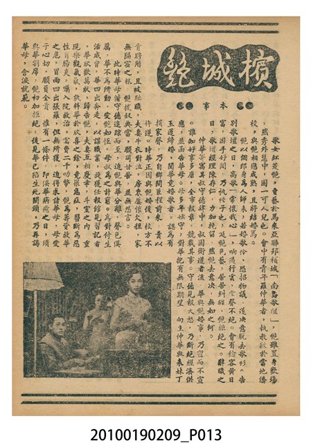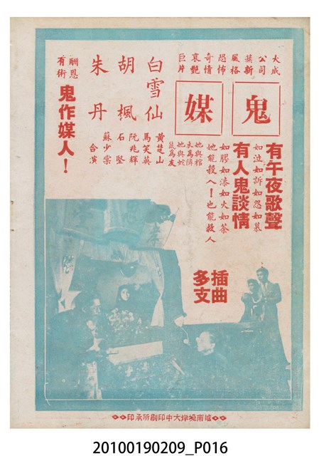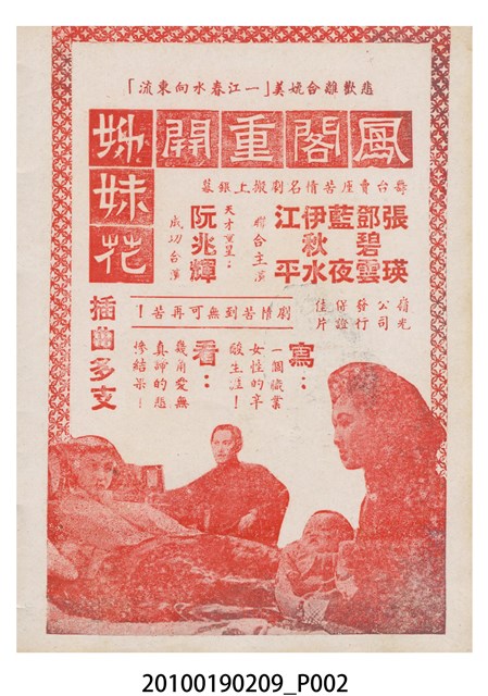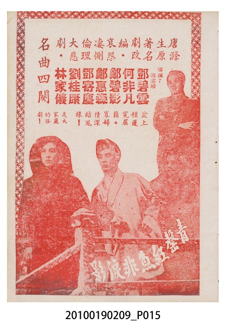 1. 香港粵語片《檳城艷》等片宣傳小冊,封面由劇照和彩色插圖構成,並標明「檳城艷」字樣,封底則為《鬼媒》(1954)的廣告,內頁包括《檳城艷》的電影故事、曲詞、演員表,以及《鳳閣重開姊妹花》(1954)、《青磬紅魚非淚影》(1954)的全版廣告。2. 《檳城艷》為1954年由香港植利影片公司出品,李鐵導演,芳艷芬、羅劍郎、鄭碧影、蘇少棠、林妹妹、李月清等人主演的時裝香港粵語片,描述教師羅仲華瞞着家人,與歌女紅菱艷同居,後遭學校迫令辭職,更患上急病,紅菱艷答應華母與華脫離關係,然其母終為二人真情所動,有情人終成眷屬。