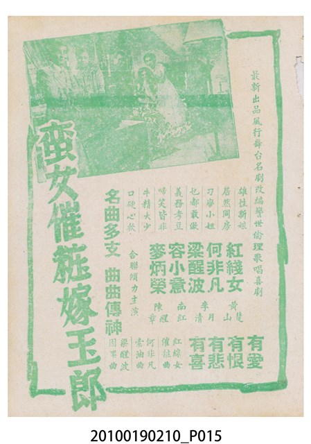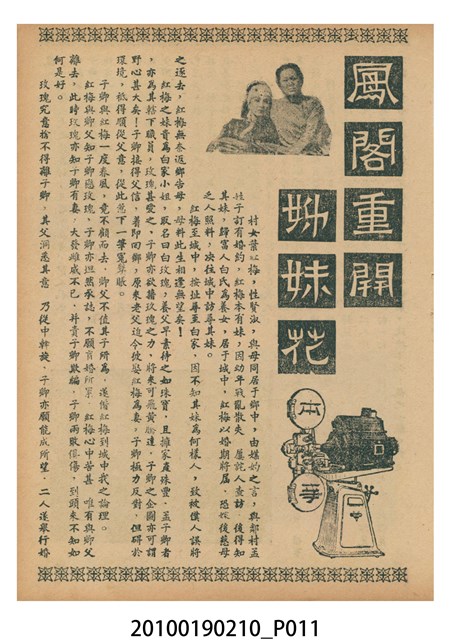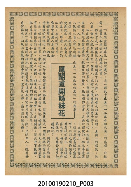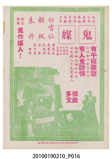 1. 香港粵語片《鳳閣重開姊妹花》等片宣傳小冊,封面由劇照和彩色插圖構成,並標明「鳳閣重開姊妹花」字樣,封底則為《鬼媒》(1954)的廣告,內頁包括《鳳閣重開姊妹花》的電影故事、曲詞、演員表等,以及《十載尋夫記》(1954)、《蠻女催粧嫁玉郎》(1954)的電影廣告。2. 《鳳閣重開姊妹花》為1954年由香港大方影業公司出品,楊工良、凌雲導演,張瑛、鄧碧雲、阮兆輝、江平、藍夜、伊秋水等人主演的時裝香港粵語片,描述孟子卿拋棄盲婚妻子葉紅梅,再娶富家女白玫瑰,葉紅梅子錦兒淪為擦鞋童,偶遇孟子卿,父子相認,白玫瑰與孟子卿爭執時意外受傷,臨終時被葉紅梅認出為失散多年的親妹。