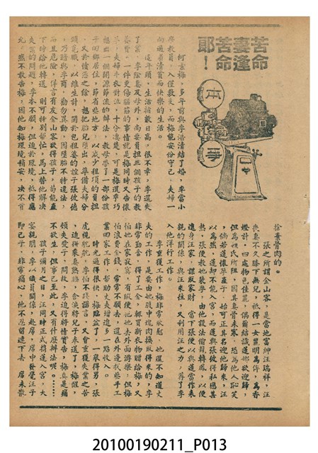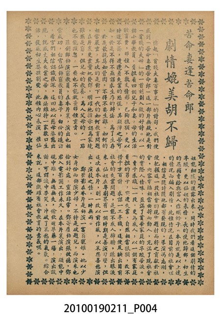 1. 香港粵語片《苦命妻逢苦命郎》等片宣傳小冊,封面由劇照和彩色插圖構成,並標明「苦命妻逢苦命郎」、「胡不歸姐妹作」字樣與導演與主演演員名稱,封底則為《黃飛鴻正傳》(1955)的廣告,內頁包括《苦命妻逢苦命郎》的電影介紹、故事、曲詞、片場鱗爪、演員介紹、演員表,以及《春花日日紅》(1955)、《兒女私情》(1955)的全版廣告。2. 《苦命妻逢苦命郎》為1954年由香港金華影業公司出品, 馮志剛導演,白雪仙、羅劍郎、鄭碧影、檸檬、鄧寄塵、陶三姑等人主演的時裝香港粵語片,描述李浩清失業途窮,只好將妻子何素梅剛誕下的嬰孩賣予鄰居彼德,蓮娜本與彼德相愛卻為錢嫁給富商汪瑞祥。最終李浩清與何素梅夫婦倆迫於生計,幾度被騙與無奈送養孩子的故事。