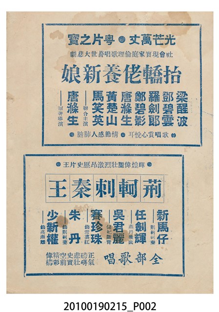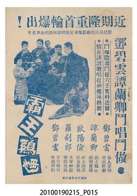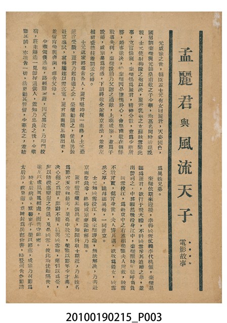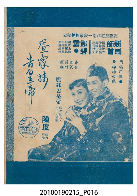 1. 香港電影《孟麗君與風流天子》於越南戲院上映時的電影本事小冊。雙色的封面印有片名「孟麗君與風流天子」,標明「全部歌唱特刊」,底圖為全版劇照。本事封底為電影廣告,介紹粵語片《蛋家妹告皇帝》;內頁則有《抬轎佬養新娘》、《荊軻刺秦王》、《蛋家妹告皇帝》的電影廣告。2. 香港電影《孟麗君與風流天子》為東方影業公司於1955年出品的粵語戲曲片,由馮志剛導演、盧雨岐編劇,新馬師曾、任劍輝、吳君麗等領銜主演。吳君麗為1960年代香港粵語片紅星及著名粵劇花旦,她曾與鄧碧雲、鳳凰女、羅豔卿、余麗珍、林鳳等7位粵劇女演員結義金蘭,號稱「八牡丹」。吳君麗一生演出電影超過150部,包括粵劇電影及時裝電影,曾於1962年自組「新麗聲影業公司」,直接參與電影拍攝工作。1970年代她參加粵劇團演出多部作品,演出過著名粵劇包含《香羅冢》、《白兔會》、《雙仙拜月亭》等。