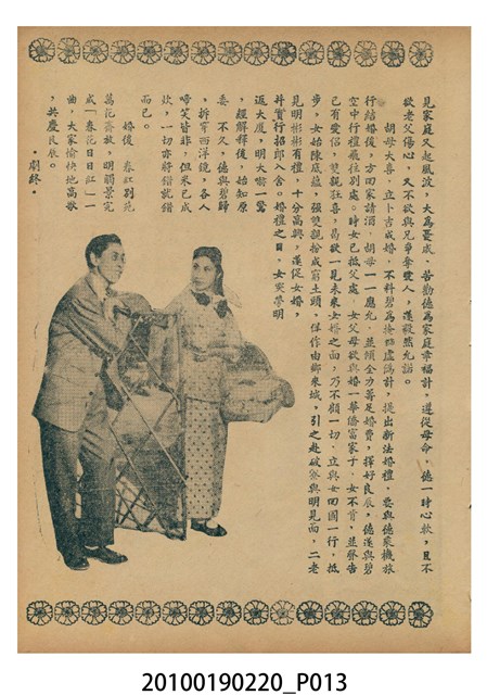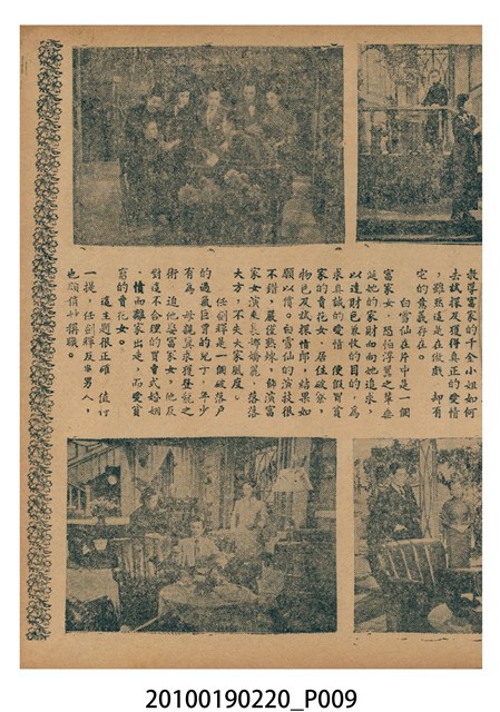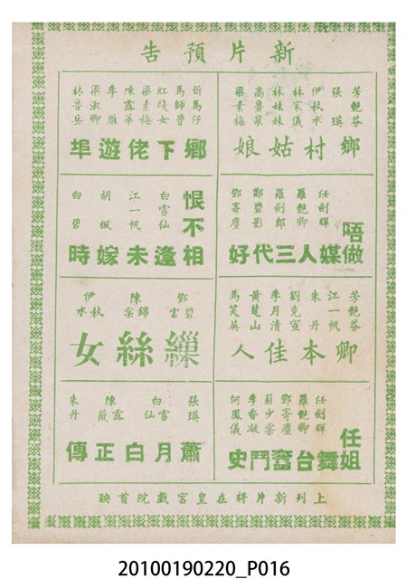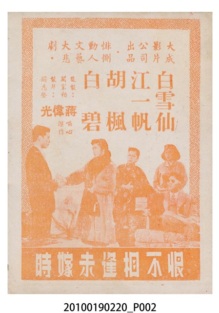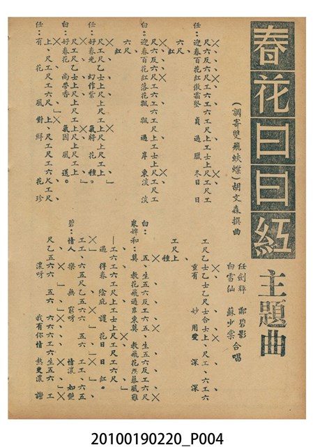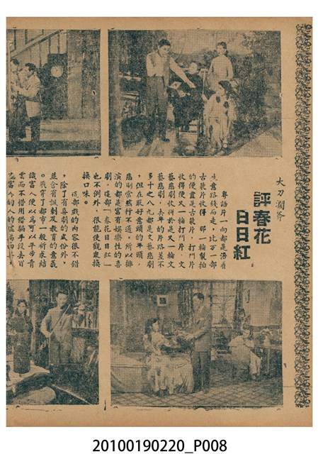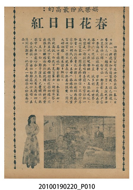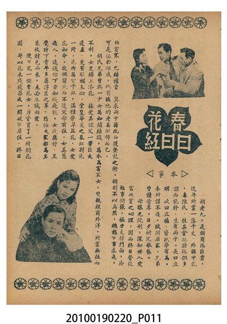 1. 香港電影《春花日日紅》於越南戲院上映時的電影本事小冊。彩色的封面印有片名「春花日日紅」,標明「歌唱輕鬆言情」、「優秀粵語巨片」、「皇宮首映」,並列出主演演員名單。印有主演的劇照人像。左下角印有「越華影業公司」商標」商標。本事封底為「皇宮戲院」的電影新片預告廣告,介紹粵語片《鄉下佬遊埠》、《恨不相逢未嫁時》、《繅絲女》、《蕭月白正傳》、《鄉村姑娘》、《唔做媒人三代好》、《卿本佳人》、《任姐舞台奮鬥史》。2. 香港電影《春花日日紅》為四海影業公司於1955年出品的粵語喜劇片,馮志剛導演、馮一葦編劇,任劍輝、白雪仙、鄭碧影等領銜主演。馮志剛與馮一葦為兄弟,馮志剛擅長電影導演與編劇,馮一葦亦為粵劇與電影編劇。1937年,馮志剛、馮一葦兄弟合作拍攝愛國抗戰電影《焦土抗戰》。馮志剛活躍於1930-1970年代,一生執導近200部電影。與與黃岱、莫康時、龍圖、胡鵬、李鐵、吳回、黃鶴聲、盧雨岐、珠璣合稱「十大導」(十大粵語片導演)。