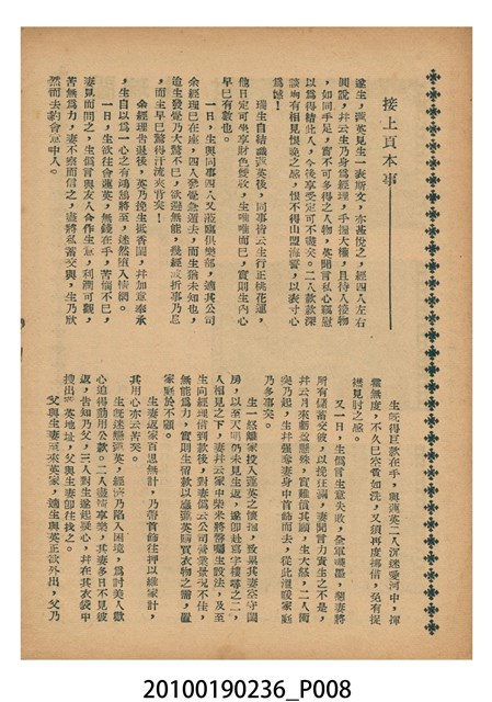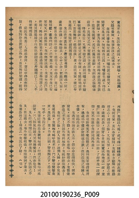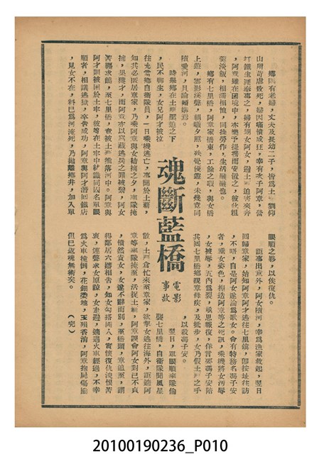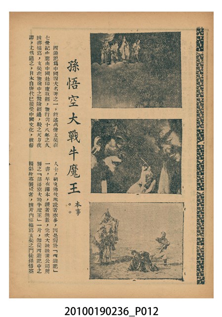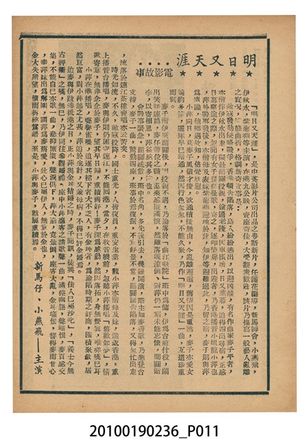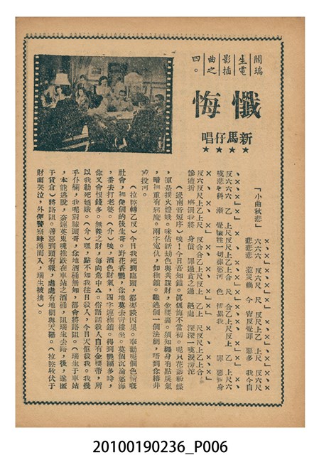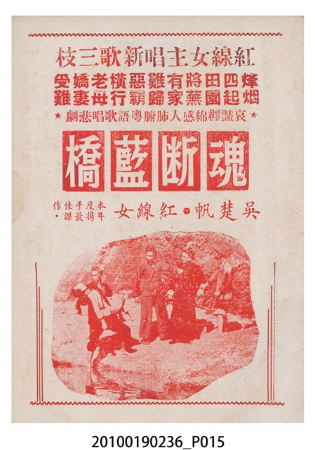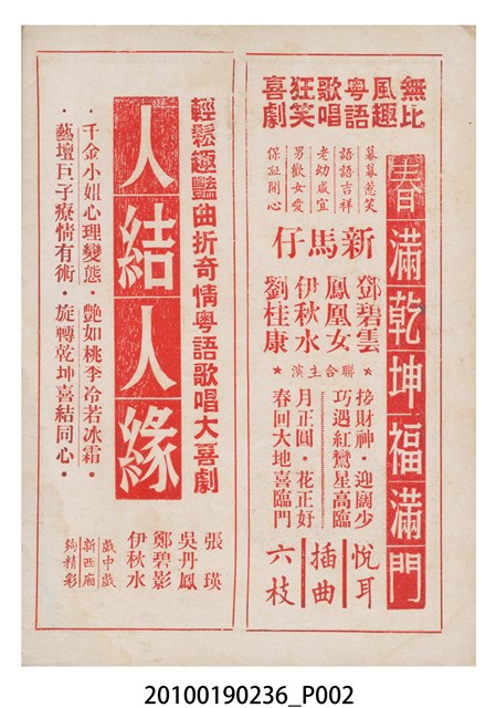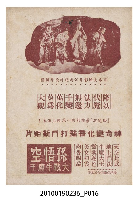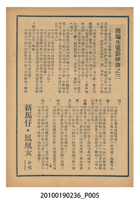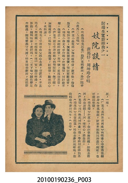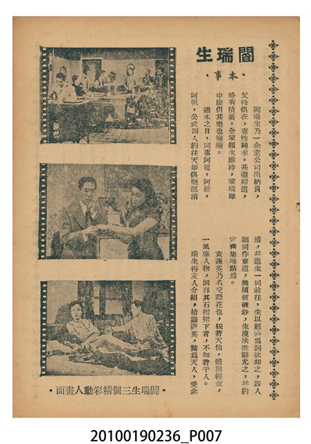 1. 香港粵語片《閻瑞生》等片宣傳小冊,封面由劇照和彩色插圖構成,並標明「閻瑞生」、「電影歌曲特輯」等字樣,封底則為《孫悟空大戰牛魔王》(?)的電影廣告,內頁包括《閻瑞生》的本事、曲詞,以及《春滿乾坤福滿門》(1954)、《人結人緣》(1954)的半版廣告,以及電影《魂斷藍橋》(1950)、《明日又天涯》(1947)、《孫悟空大戰牛魔王》(?)的電影故事與廣告。2. 《閻瑞生》為1954年由香港浩華影業公司出品,楊工良、凌雲導演,新馬師曾、周坤玲、鳳凰女、黃超武、伊秋水等人主演的歌唱香港粵語片,描述小職員閻瑞生戀上交際花黃蓮英,多番騙妻錢財供英揮霍,甚至不惜虧空公款,閻瑞生被警方通緝,走投無路之餘把英勒斃,最終被捕處死。