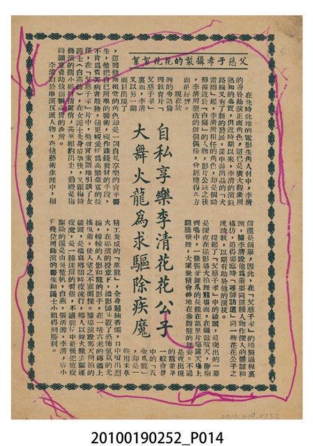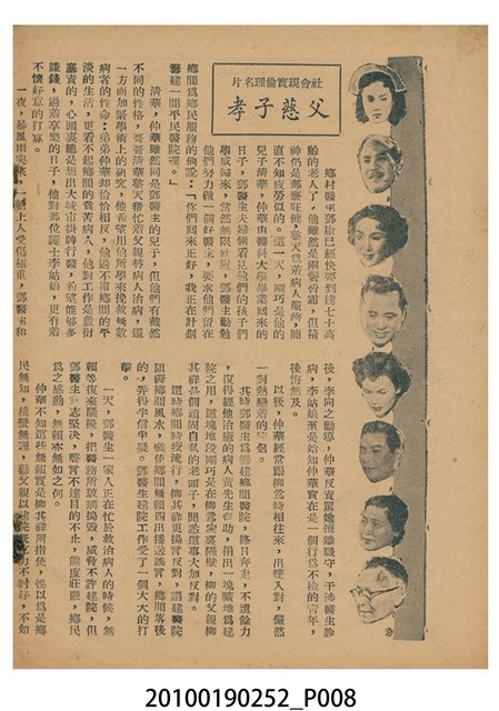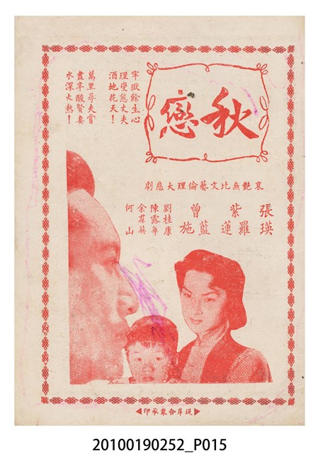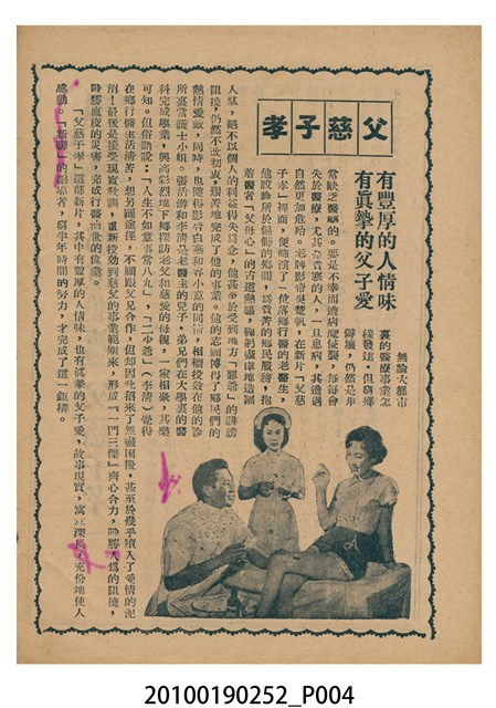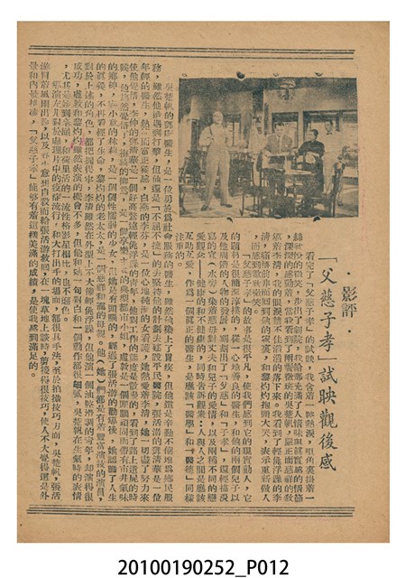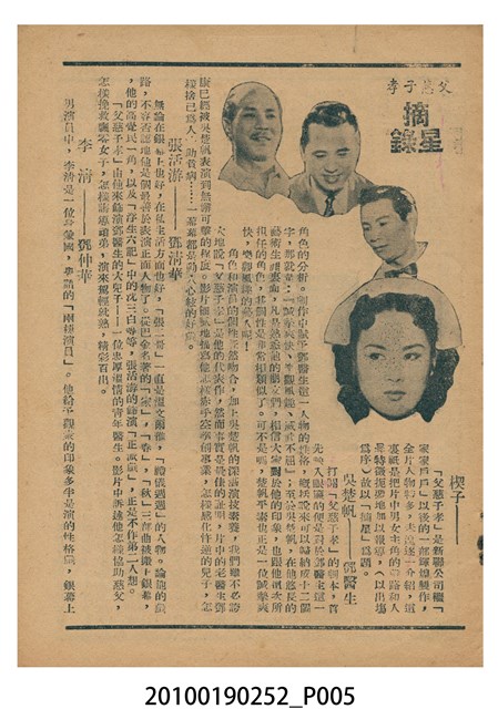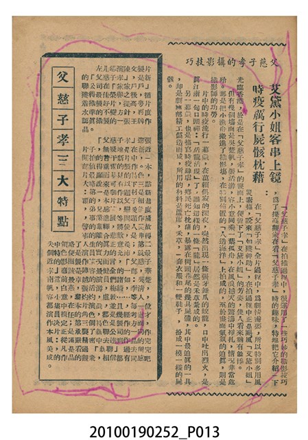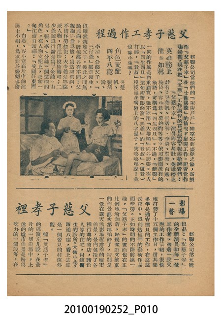 1. 香港電影《父慈子孝》於越南戲院上映時的電影本事小冊。以橘色為底色的本事封面印有片名「父慈子孝」、「新聯公司第五部出品社會現實倫理名片」的廣告文字與主演演員名單。本事封底則為下期上映電影《杜鵑魂》的廣告,片名旁印有「一顆重量催淚彈」、「影藝公司繼百變婦人心第二部出品」等廣告文案,以及導演與演員名單。本事內頁則收錄《父慈子孝》的故事、電影工作過程及佈景、外景介紹、電影特點與花絮和觀後感等內容,以及《母親》、《秋戀》的電影廣告。2. 香港電影《父慈子孝》是1954年新聯影片出品的粵語劇情片,由左幾執導,吳楚帆、李清等主演。影片講述了鄧華仲、鄧華清兄弟二人追隨父志、父子三人同心協力實現理想的故事。新聯影業公司為活躍於1950至1980年代的香港電影公司,曾出品《敗家仔》(1952)、《父慈子孝》與《亂世英雄亂世情》(1986)等70餘部電影。
