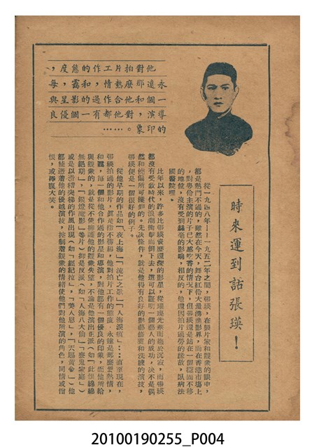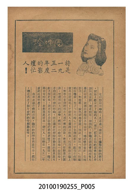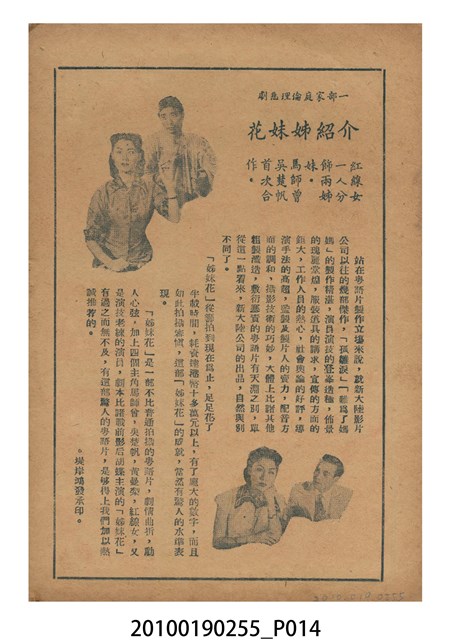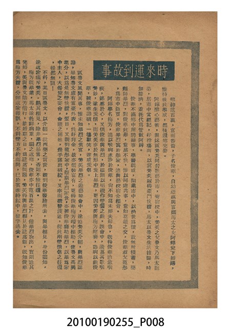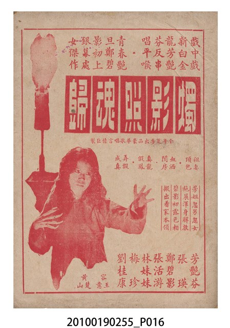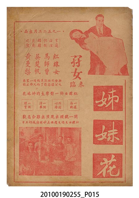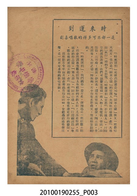 1. 香港粵語片《時來運到》等片宣傳小冊,封面由劇照和彩色插圖構成,並標明「時來運到」、「越華影業公司映權」等字樣,封底則為《燭影照魂歸》(1952)的全版廣告,內頁包括《時來運到》的影片介紹、演員張瑛、周坤玲、白雪仙、吳楚帆、盧敦、伊秋水等的介紹、演員表與曲詞、故事內容,以及《此恨綿綿無絕期》(1948)、《姊妹花》(1952)的全版電影廣告。2. 《時來運到》為1952年由香港成昌影業公司出品,吳回導演,吳楚帆、張瑛、盧敦、白雪仙、周坤玲、伊秋水等人主演的時裝香港粵語片,描述城中醫生范俊華,父親百萬雖富甲一方卻吝嗇成性,常催俊華回鄉迎娶素未謀面的未婚妻馬梅芳。馬梅芳到了城中修讀藝術,她的表妹區美英父親常希望女兒嫁得金龜婿,經過一系列騙婚與逃婚計謀,范家、馬家終得悉大家都是李代桃僵,幸最終得締結良緣。