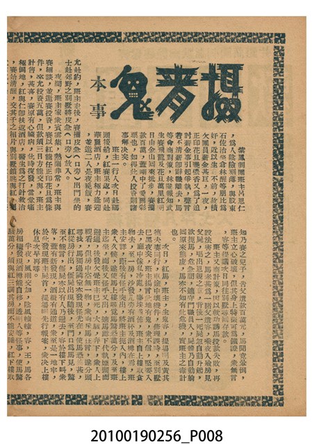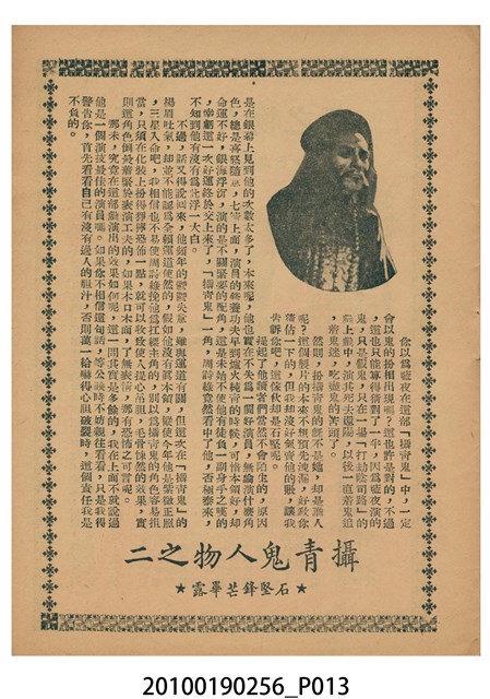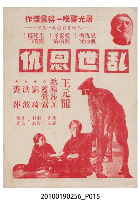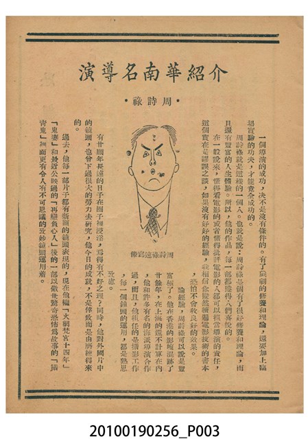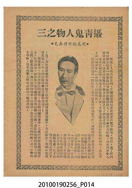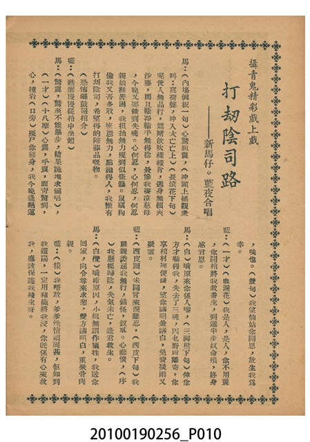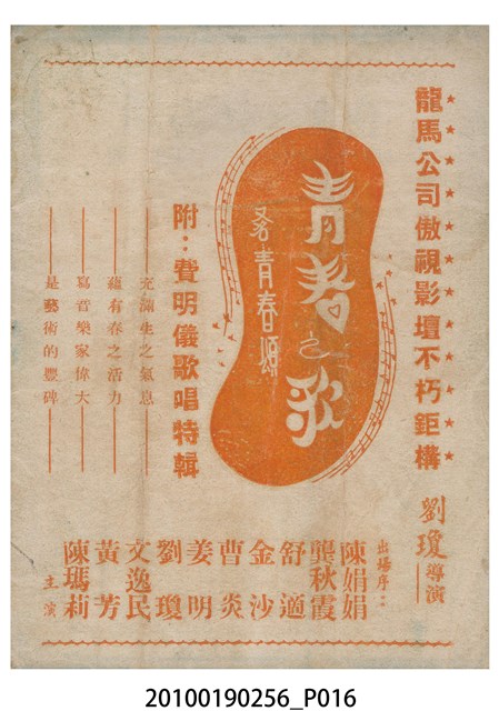 1. 香港粵語片《攝青鬼》等片宣傳小冊,封面由劇照和彩色插圖構成,並標明「攝青鬼」、「新馬仔.藍夜」、「繼『鬼妻』後再度攜手驚人鉅獻」字樣,封底則為《青春之歌》(1953)的廣告,內頁包括《攝青鬼》的導演周詩祿、人物介紹、演員表、故事簡介、曲詞,以及電影《亂世恩仇》(1952)、《水紅菱》(1953)的全版廣告。2. 《攝青鬼》為1953年由香港龍鳳公司出品,周詩祿導演,新馬師曾、藍夜、周志誠、劉桂康 、石堅、梁玉崑等人主演的香港粵語片,描述粵劇團領班呂思仁好賭,劇團經濟因而出現問題;老倌賽飛龍中了彩票,領班和他朋友石佐治終於說服他投資劇團,賽飛龍卻突然心臟病發作,臨終前託義女萬里紅代尋失散兒子馬天祥,將藏在別墅內的彩金轉交給他,眾人於藏錢的別墅度宿,班主卻突然被殺,鬼影幢幢,原來是石石佐治的奪產陰謀。