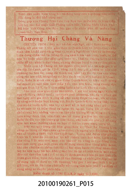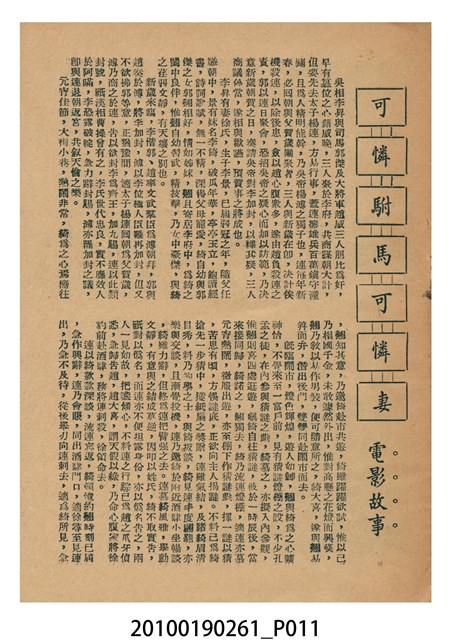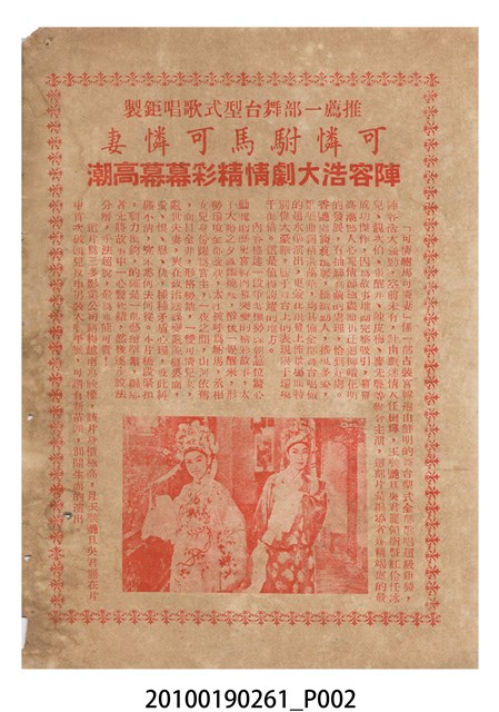 1. 香港電影《可憐駙馬可憐妻》於越南戲院上映時的電影本事小冊。以彩色印刷的本事封面印有片名「可憐駙馬可憐妻」字樣。本事封底為下期上映電影《兩代恩情》的廣告,印有「生娘不及養娘恩,養子當承親子禮!」、「內容描寫一位蓬門少婦遇人不淑 境況堪憐 絕處逢生獲拯」等廣告文案字樣及主演演員名單。本事內頁則收錄《可憐駙馬可憐妻》的故事介紹、精彩曲詞及工尺譜,以及演員表等。2. 香港電影《可憐駙馬可憐妻》由美亞影片公司於1960年出品。該片是由黃岱導演,任劍輝、吳君麗、靚次伯等領銜主演的粵語戲曲電影。美亞影片為活躍於1959至1961年間的香港電影公司,曾出品《除卻巫山不是雲》(1959)、《可憐駙馬可憐妻》與《一張白紙告親夫》(1961)等六部電影。
