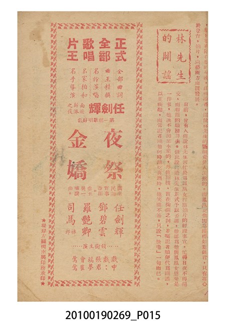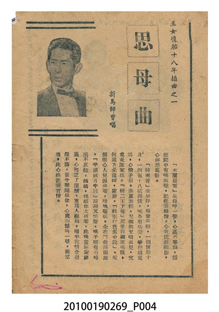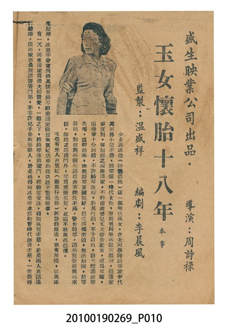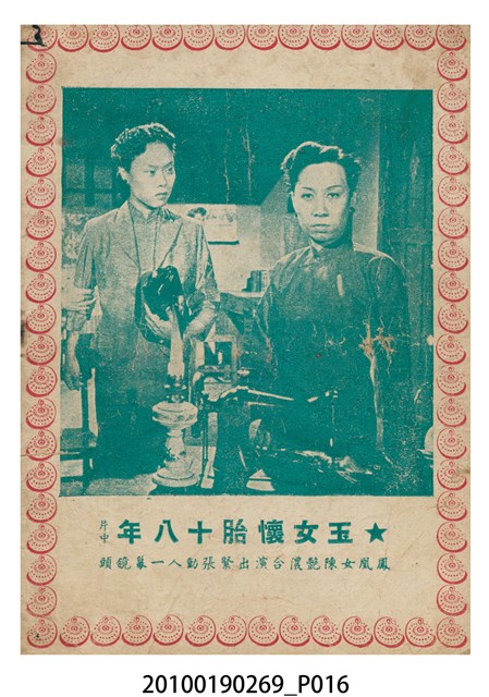 1. 香港電影《玉女懷胎十八年》於越南的戲院上映時的電影本事小冊小冊。以紅綠雙色印刷的本事封面印有片名「玉女懷胎十八年」字樣。本事封底為下期上映電影《艷陽長照牡丹紅》的廣告,註記有「龍鳳影業公司出品 輕鬆清鮮爽心大喜劇!」、「富貴花開 豔陽長照 少爺好運 姊妹芬芳 得心應乎」等廣告文案。本事內頁則收錄《玉女懷胎十八年》包括〈思母曲〉、〈搖籃曲〉、〈遊樂園〉等多首曲詞、該片的故事,片中動人鏡頭劇照,以及粵語戲曲電影《夜祭金嬌》(1954)的電影廣告。2. 香港電影《玉女懷胎十八年》是由周詩祿執導,新馬師曾、鳳凰女等主演的電影,該片於1954年由盛生公司出品。劇情內容描述寡婦陳綺琴再婚,但未來夫家家風守舊,只好把兒子潘孝慈交託好友謝冰瑩照顧,謝冰瑩惟有獨力撫養慈,待潘孝慈長大成材後投身孤兒院服務的故事。盛生電影公司於1954年成立,僅有出品《玉女懷胎十八年》此部電影的紀錄。