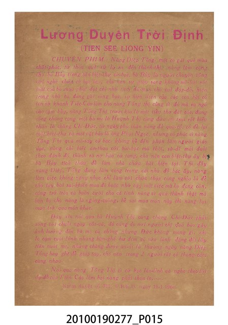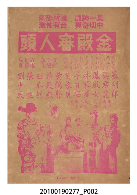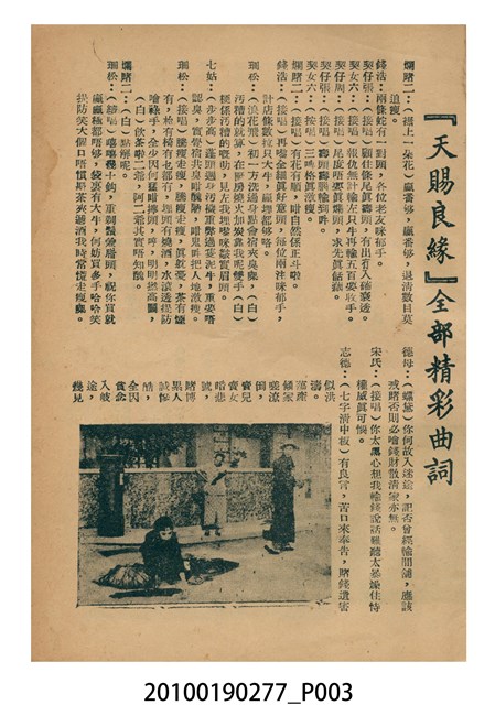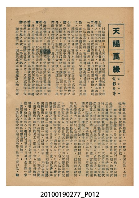 1. 香港電影《天賜良緣》於臺灣戲院上映時的電影本事小冊。本事封面印有片名「天賜良緣」與「桃源公司出品風趣歌唱大喜劇」字樣,以及主演演員名單。本事封底為下期上映影片廣告,介紹另一部粵語片《魂化瑤台夜合花》,標明「芳艷芬又一舞台戲寶搬上銀幕」、「敬請注意映期」字樣,並於右讓側列出主演演員名單。內頁則收錄該片的精彩曲詞與工尺譜、電影故事,以及《金殿審人頭》的電影廣告。2. 香港電影《天賜良緣》由桃源電影企業公司於1959年出品。由龍圖導演,芳豔芬、羅劍郎、李香琴、鄭君綿、白龍珠、馬笑英等領銜主演。桃源影業為1958年由李會桃創辦的香港電影公司,活躍於1950至60年代,曾出品《枇杷巷口故人來》(1959)、《獅吼記》(1959)等多部由龍圖導演、馮寶寶主演的各類型香港電影。1947年亦有同名粵語喜劇電影,由文英影業公司出品,吳回導演,張瑛、黃曼梨主演。影片類型、情節內容與本片完全不同。