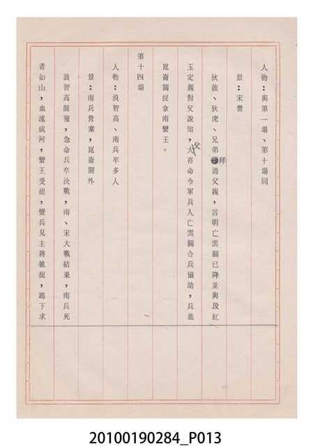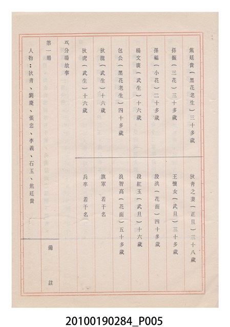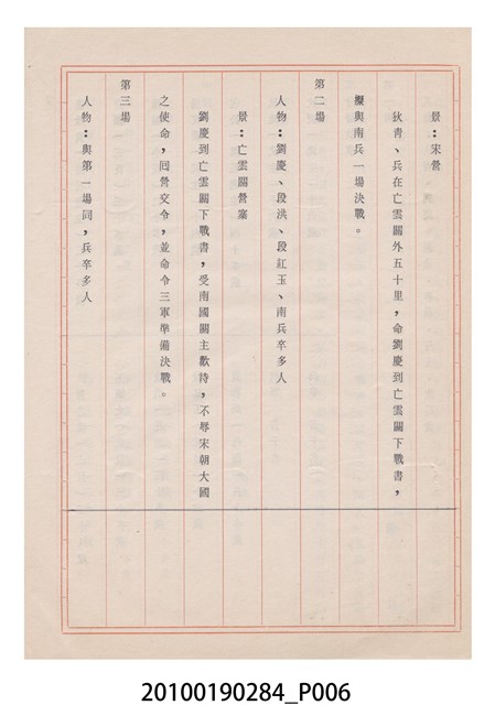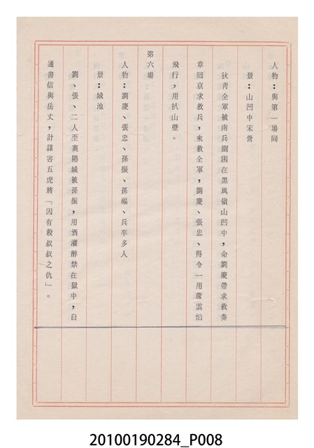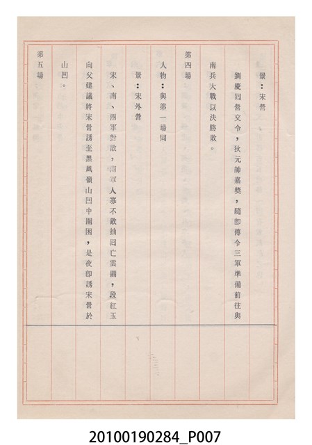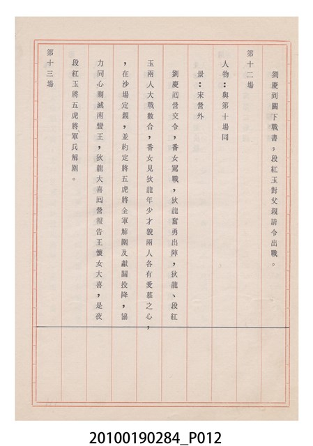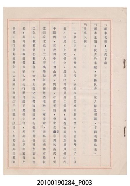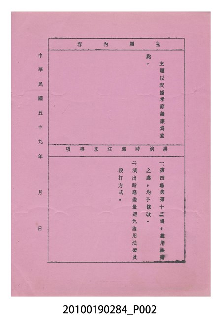 1.本件為錦五洲掌中劇團送審掌中劇故事《五虎平南》,由真五洲掌中劇團撰寫演出1天用的故事,呈送予臺灣省地方戲劇協進會審查,經審審查後以(59)修總字第70號發回。2.臺灣省地方戲劇協進會於民國41年成立,推動歌仔戲、布袋戲等戲劇遵照「反共抗俄」的國家政策,改良戲劇符合社會教育目標。協進會的任務之一為劇本提供及改良,民國59年成立編劇委員會並設置劇本編修小組,修改各劇團送審的劇本。