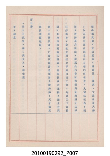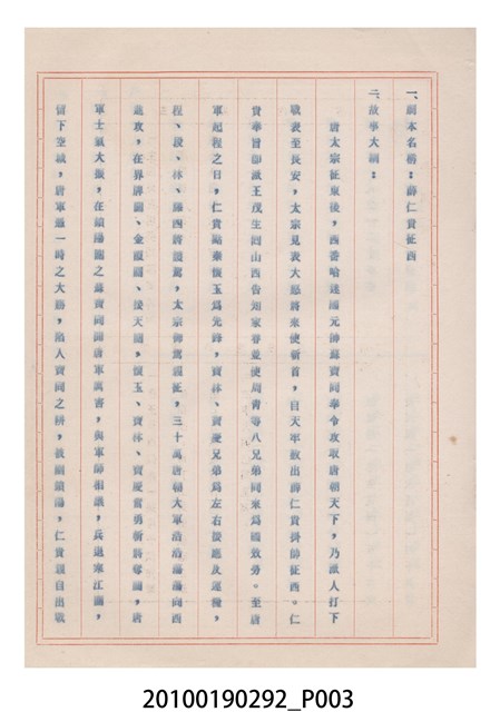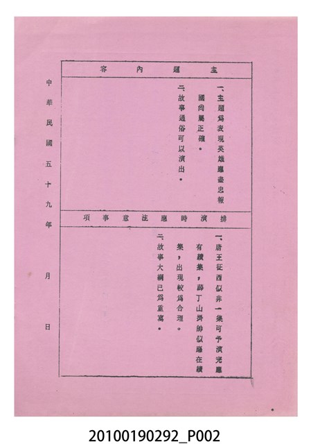 1.本件為復安社掌中劇團送審掌中劇故事《薛仁貴征西(第一集)》,由復安社掌中劇團撰寫演出1天用的故事,呈送予臺灣省地方戲劇協進會審查,經審審查後以(59)修總字第133號發回。2.臺灣省地方戲劇協進會於民國41年成立,推動歌仔戲、布袋戲等戲劇遵照「反共抗俄」的國家政策,改良戲劇符合社會教育目標。協進會的任務之一為劇本提供及改良,民國59年成立編劇委員會並設置劇本編修小組,修改各劇團送審的劇本。