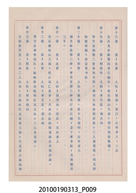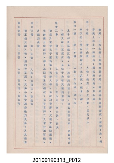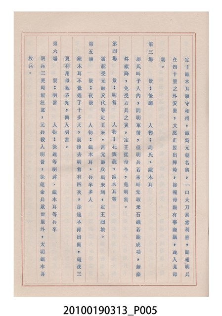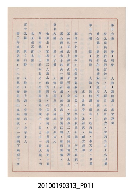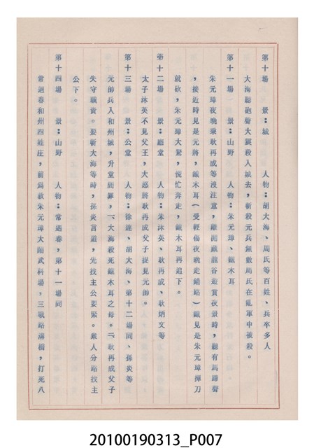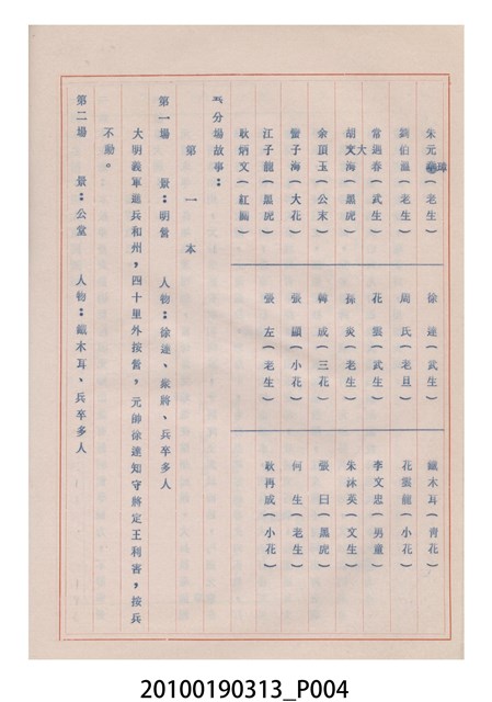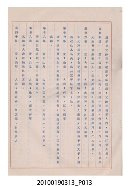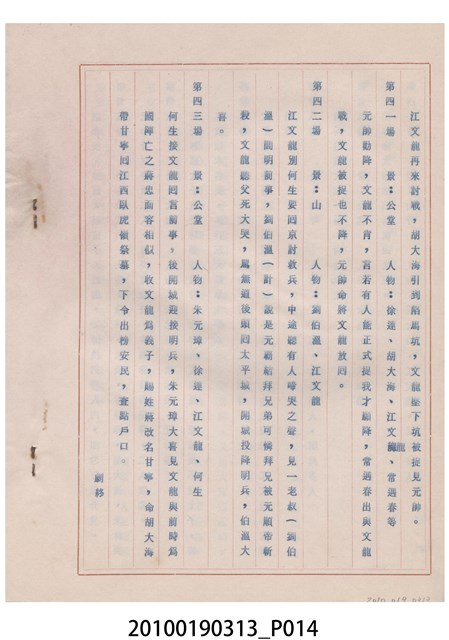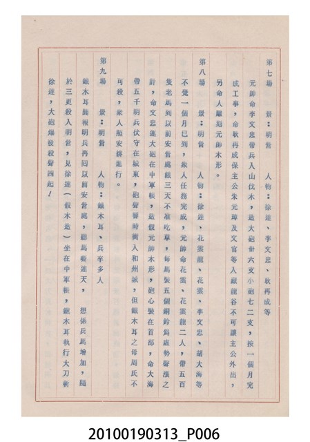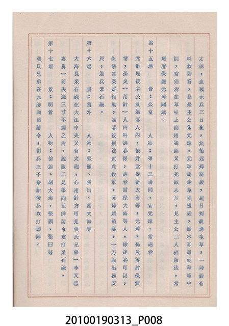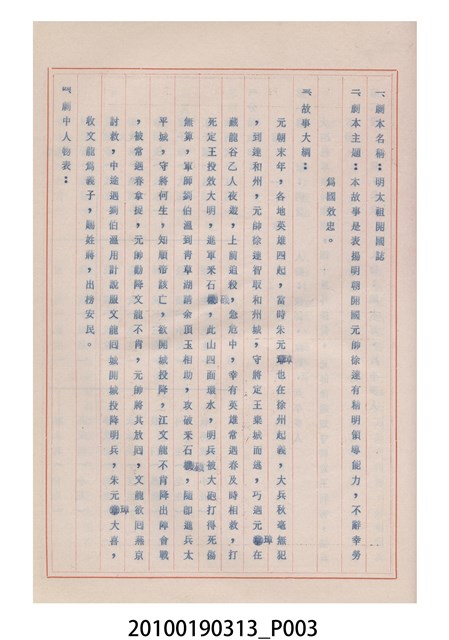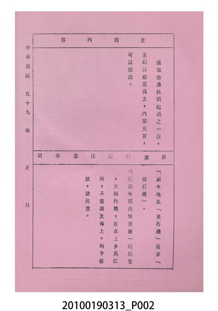 1.本件送審劇本《明太祖開國誌》是正同樂天掌中劇團送審的「(59)修總字第263號」劇本,內容是表揚明朝開國元帥徐達有精明領導能力,不辭辛勞、為國效忠的故事。2.民國41年(1952),國民政府高舉反共抗俄的年代,由黨政機關主導成立的臺灣省地方戲劇協進會,一方面為貫徹政府意志,輔導民間劇團演出方向的工作,一方面匯集民間劇團與演藝人員的力量,共謀生存、福利與發展的平臺,實際上具有同業公會的性質與功能。