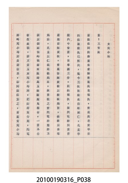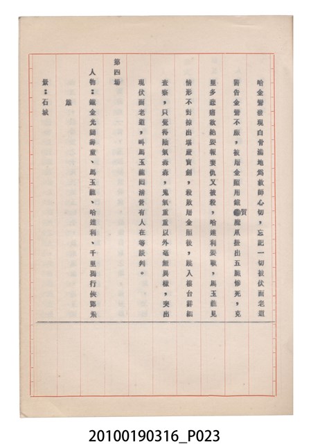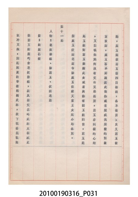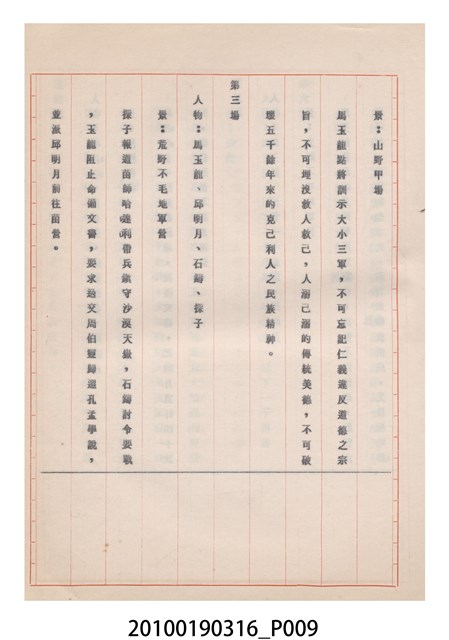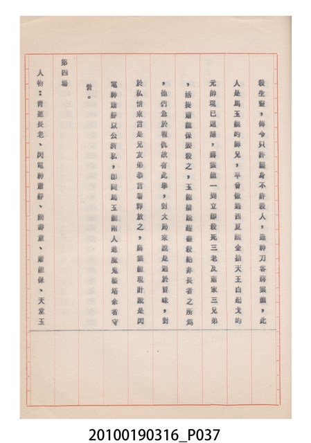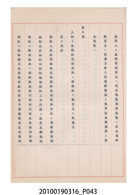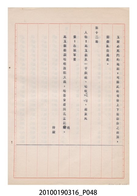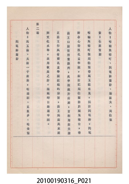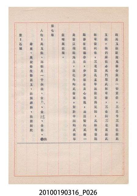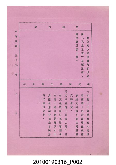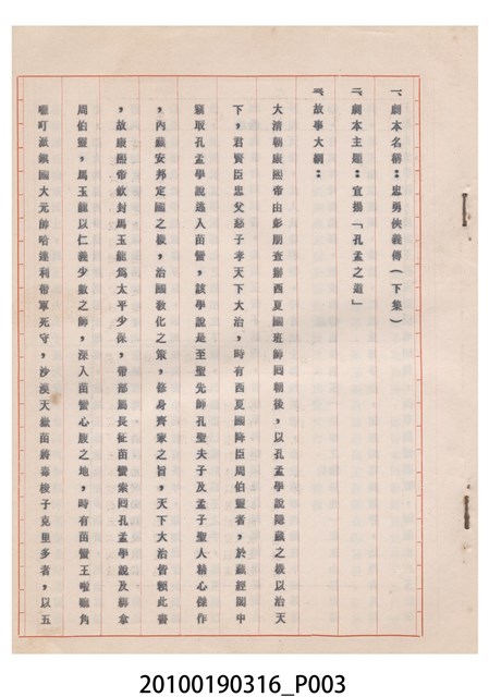 1.本件送審劇本《忠勇俠義傳(下集)》是新人形掌中劇團送審的「(59)修總字第81號」劇本,內容描寫清代康熙皇帝派彭朋查辦西夏國班師回朝後,宣揚孔孟學說,西夏國降臣周伯靈竊取孔孟學說逃入苗蠻,經康熙皇帝派馬玉龍帶部屬征苗蠻,索回孔孟學說,挷拿周伯靈的俠義故事。2.民國41年(1952),國民政府高舉反共抗俄的年代,由黨政機關主導成立的臺灣省地方戲劇協進會,一方面為貫徹政府意志,輔導民間劇團演出方向的工作,一方面匯集民間劇團與演藝人員的力量,共謀生存、福利與發展的平臺,實際上具有同業公會的性質與功能。