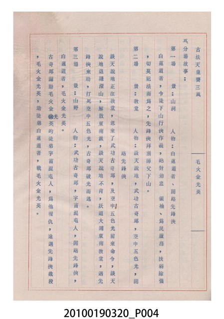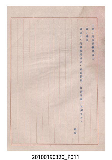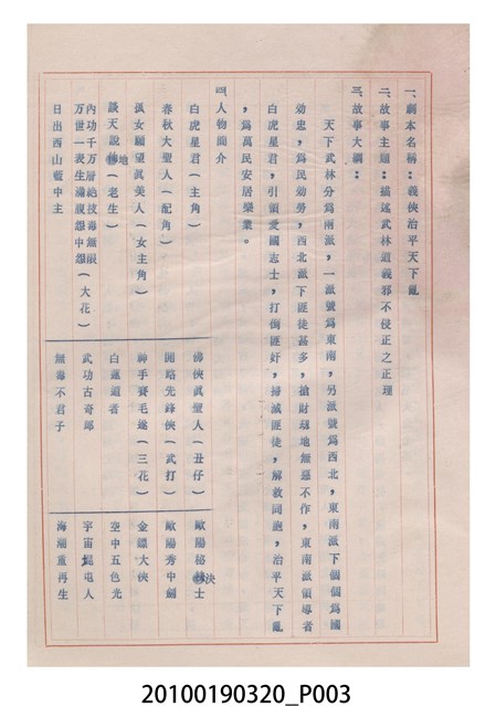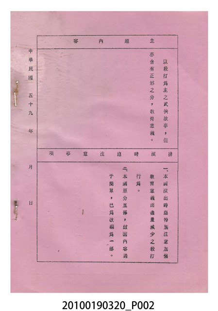 1.本件送審劇本《義俠治平天下亂》是富山掌中劇團送審的「(59)修總字第322號」劇本,內容描寫天下分為東南派與西北派,多屬忠良的東南派對抗多為匪徒的西北派對抗的事蹟,描述武林道義邪不勝正的道理。2.民國41年(1952),國民政府高舉反共抗俄的年代,由黨政機關主導成立的臺灣省地方戲劇協進會,一方面為貫徹政府意志,輔導民間劇團演出方向的工作,一方面匯集民間劇團與演藝人員的力量,共謀生存、福利與發展的平臺,實際上具有同業公會的性質與功能。