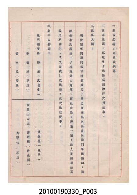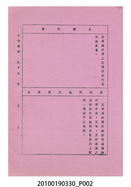 本件為長興閣劇團送審劇本《忠勇義俠傳》,由長興閣劇團撰寫掌中戲(布袋戲)《忠勇義俠傳》演出1天的劇本,呈送予臺灣省地方戲劇協進會審查。臺灣省地方戲劇協進會於1952年成立,推動歌仔戲、布袋戲等戲劇遵照「反共抗俄」的國家政策,改良戲劇符合社會教育目標。協進會的任務之一為劇本提供及改良,1970年成立編劇委員會並設置劇本編修小組,修改各劇團送審的劇本。