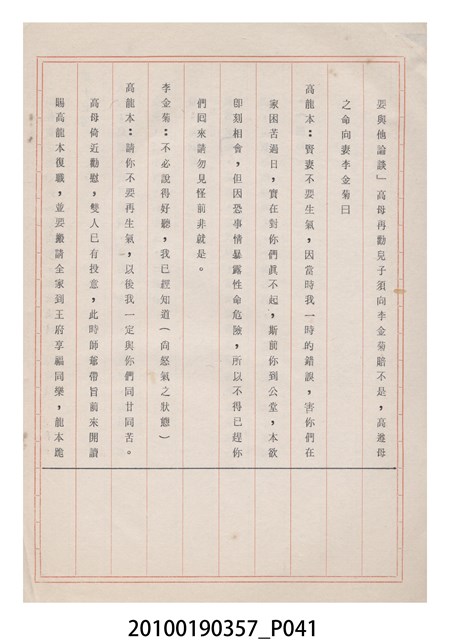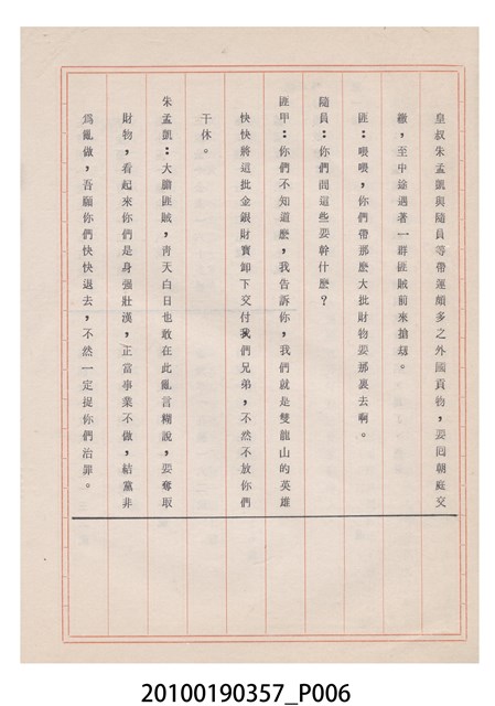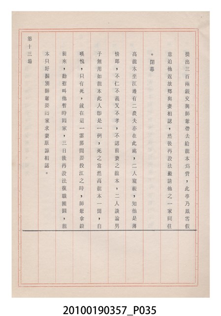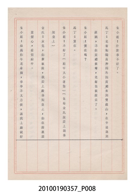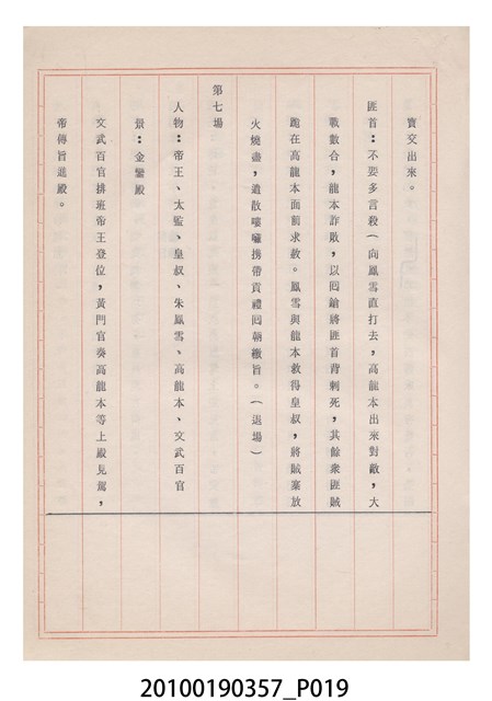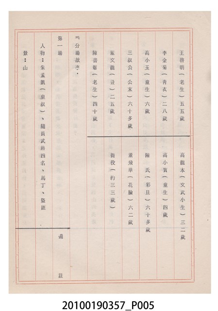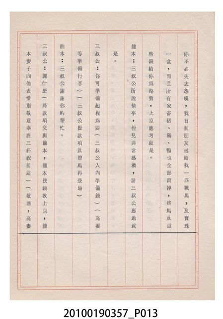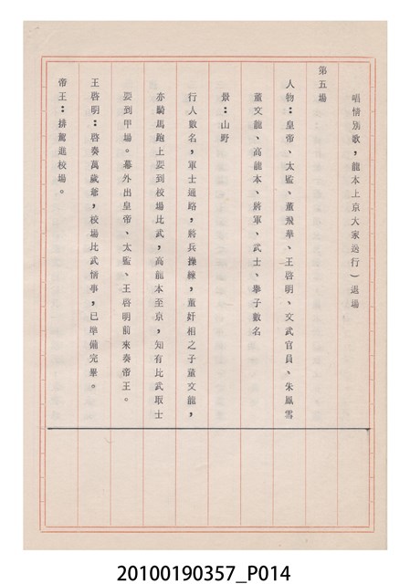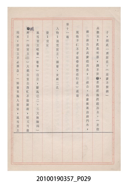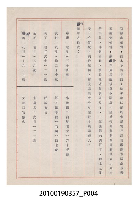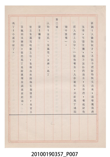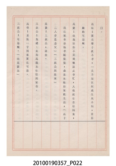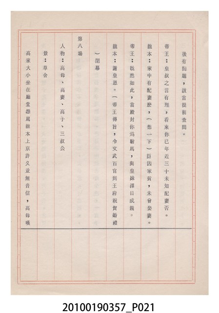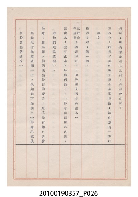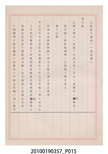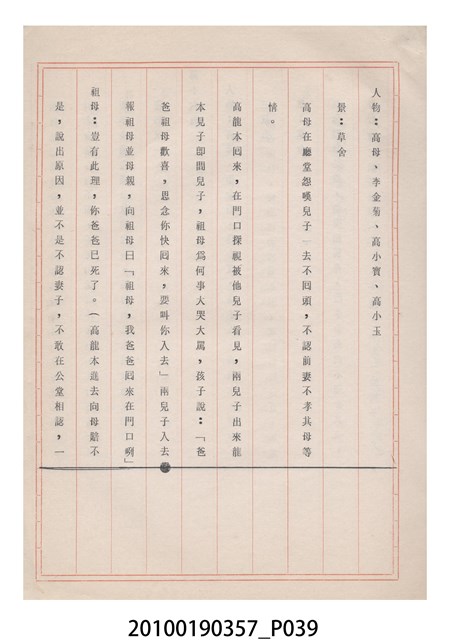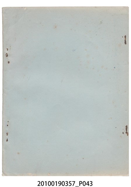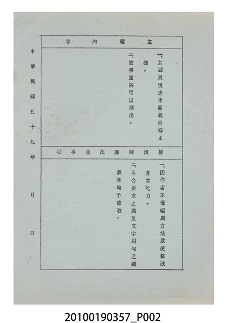 臺灣省地方戲劇協進會為1952年3月6日正式成立,協進會宗旨為「團結全省地方戲劇工作者遵照反共抗俄國策,從事改良地方戲劇、發揚民族意識、促進社會教育。」本物件為雅聲歌劇團所提之《賢婦興家》歌仔戲劇本。右上角載有修正時之編號,依其判斷時間點應為民國59年(1970)。本物件為訂書針裝訂劇本,書籍保存狀況有褪色及釘書針因其氧化後造成周邊紙材變色,其鐵鏽產生影響到周邊紙張,有鏽蝕情形出現。