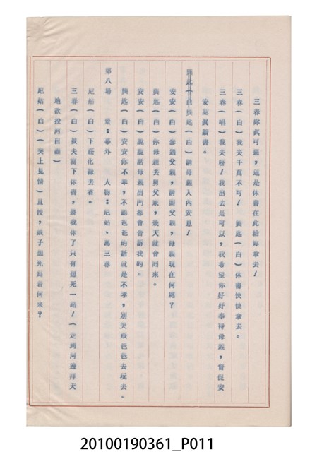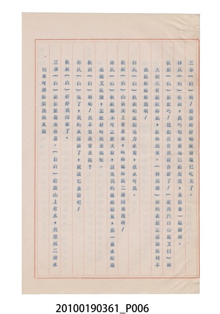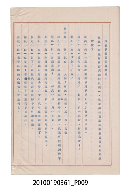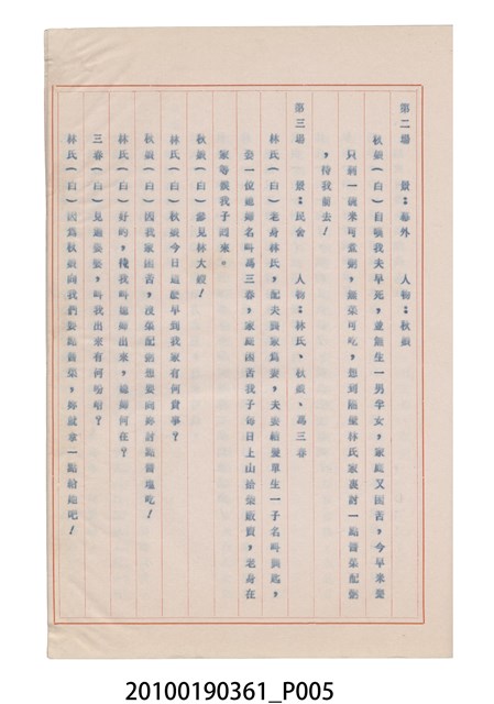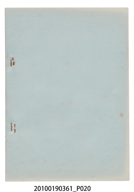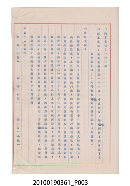 臺灣省地方戲劇協進會為1952年3月6日正式成立,協進會宗旨為「團結全省地方戲劇工作者遵照反共抗俄國策,從事改良地方戲劇、發揚民族意識、促進社會教育。」本物件為宜蘭英歌劇團所提之《一門三孝》歌仔戲劇本。右上角載有修正時之編號,依其判斷時間點應為民國59年(1970)。本物件為訂書針裝訂劇本,書籍保存狀況有褪色及釘書針因其氧化後造成周邊紙材變色,其鐵鏽產生影響到周邊紙張,有鏽蝕情形出現。