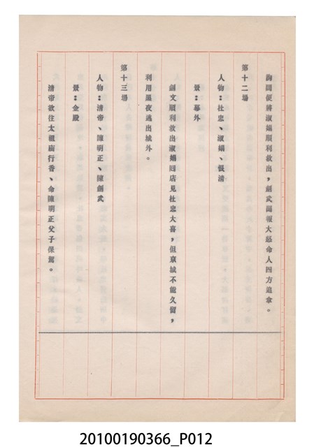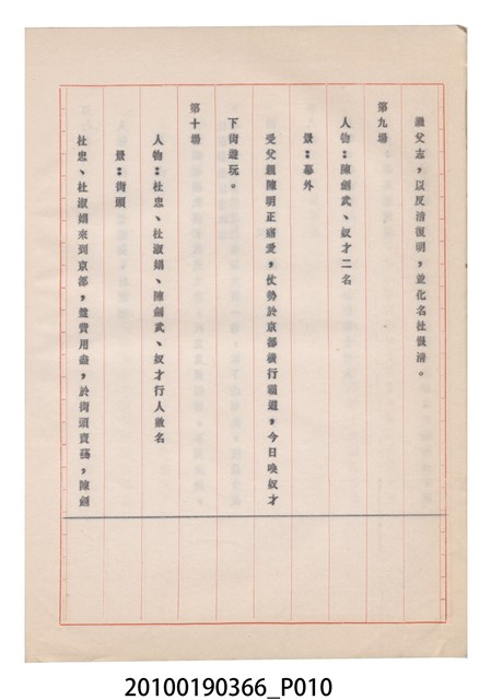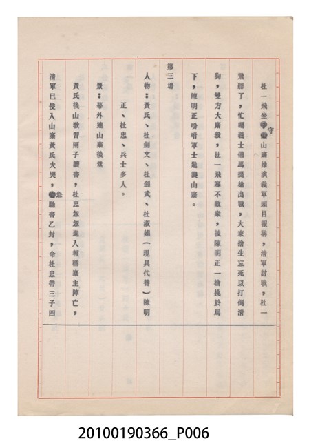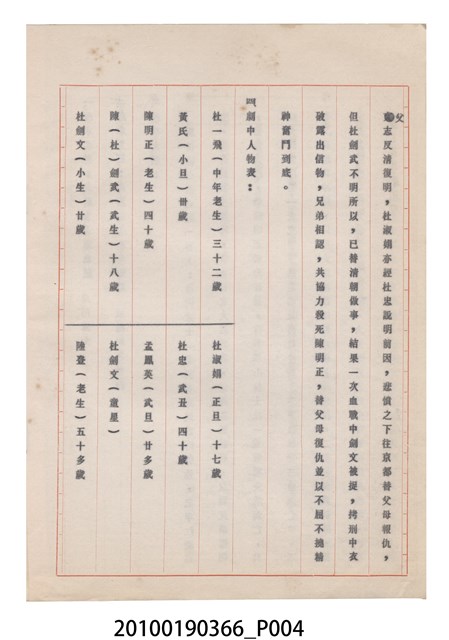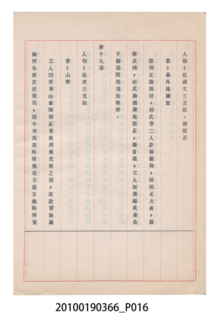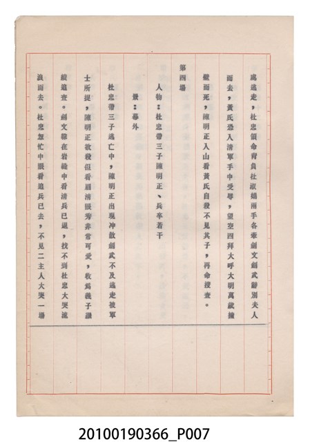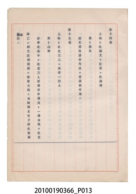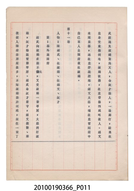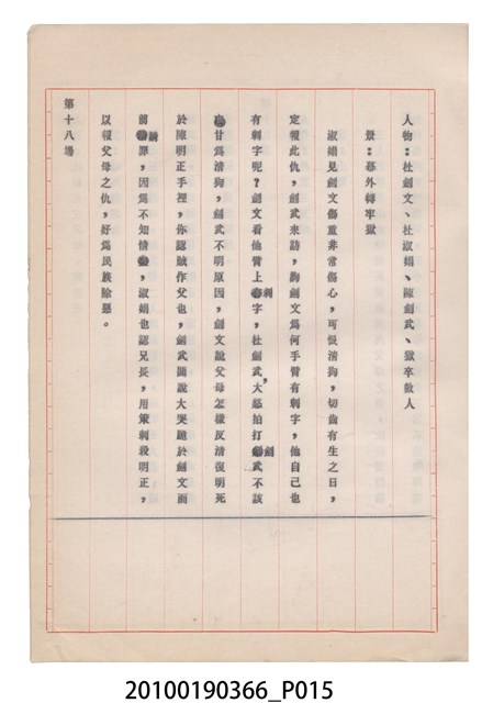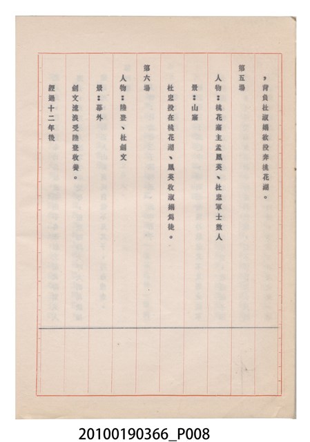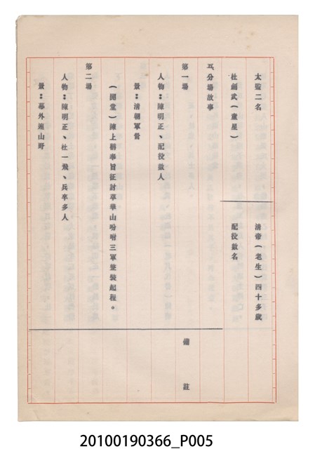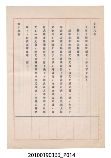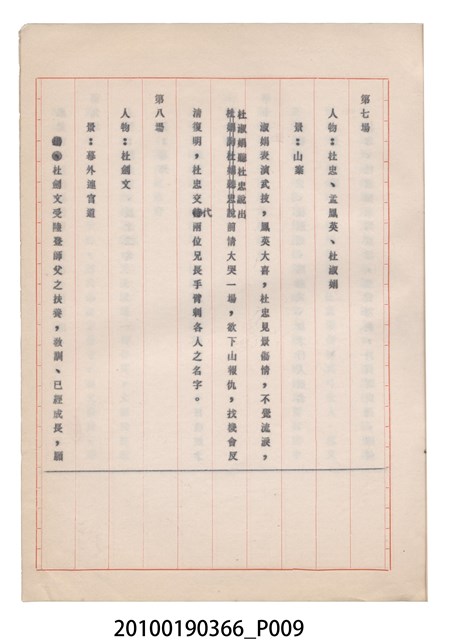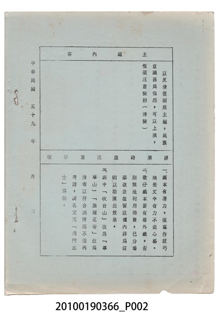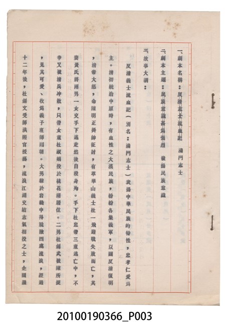 臺灣省地方戲劇協進會為1952年3月6日正式成立,協進會宗旨為「團結全省地方戲劇工作者遵照反共抗俄國策,從事改良地方戲劇、發揚民族意識、促進社會教育。」本物件為錦聲歌劇團所提之《滿門志士》歌仔戲劇本。右上角載有修正時之編號,依其判斷時間點應為民國59年(1970)。本物件為訂書針裝訂劇本,書籍保存狀況有褪色及釘書針因其氧化後造成周邊紙材變色,其鐵鏽產生影響到周邊紙張,有鏽蝕情形出現。