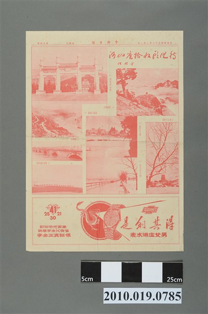 1.本物件為三燕喜單月曆,由聯合贈獎公司發行,共2面。其中一面,上半部為《中央日報》元旦增刊之彩色影印,作者為梁又銘,該圖媒材為油畫,主題是「揚帆待發歸舟」。下半部為民國53年(1964)月曆,且裝飾有三隻燕子,其各自都叼著郵票,上面寫有「三燕喜單」、「聯合贈獎」。左邊寫有「喜從天上來」的標題,內容描述三燕喜單的使用功能:「您去買東西的時候,很多商店會送給您『三燕喜單』上面有號碼,每月十五日開獎一次,從頭獎到五獎,中獎的可得洋房、電水箱、電視機、自行車、電唱機、鋼琴、照相機……。沒有中獎的『三燕喜單』,可以把它貼在精印的儲蓄簿上,保存起來,可以對各種各樣你所喜歡的物品,兌換地點在聯合贈獎公司各地分公司贈獎供應中心」。另外一面,為《中央日報》於1964年1月1日發行報紙的第14版,上右下左依序為于右任的書法、西嶽華山、浙江六和塔、得其利是男女庄游水表廣告、桂江之濱、松花江大橋、綏蒙沙漠駝隊、盧溝橋、嘉陵江遠眺、南京中山陵等圖片。