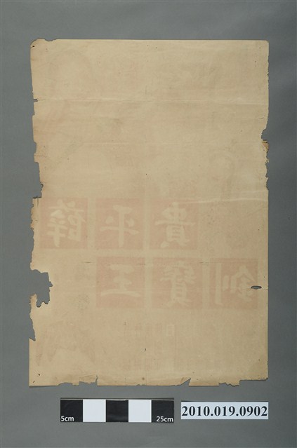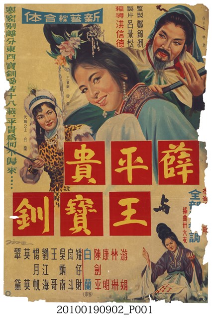 1.臺灣電影《薛平貴與王寶釧》在臺上映宣傳中文彩色印刷海報,直式,單面,風格為手繪。從背面可看出紙質薄透,可看到前方繪畫圖樣。海報主視覺為游娟身穿藍色上衣,轉身對後方露齒微笑,右上角為林琳扮演的薛平貴,留著黑色鬍子,左下角為白蘭客串的異族公主。右下角為游娟身穿黑色上衣跪在地上刺繡。版面中間註記巨大紅色方格,切成薛平貴王寶釧,紅底黃字,左側版面註記直書綠色宣傳文案「寒窯裡別離分東西,寶釧受苦十八載,平貴為何不歸來」,下方註記演職員表。劇照右側邊緣缺損嚴重,有嚴重污痕,左側邊緣與下方邊緣皆凹凸不平,背面全白但有明顯泛黃。2.《薛平貴與王寶釧》於1963年由臺灣大來影業出品,洪信德執導,游娟、林琳演出,陳子福為繪師。此故事最早之版本為1955年由何明基執導的版本,為臺灣最早的臺語電影。