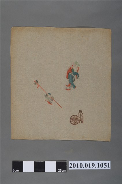 1.本文物為富貴亭餐墊,製作材質為蓪草,底色為白色,共有三個圖樣,上右下有三個圖案依序為:手持鞭炮身穿紅藍衣服頭戴帽子的日本女人,扛著雙刃釜的日本男童,下方為臺中富貴亭(ふうき亭)的標示,當時的電話為104番。