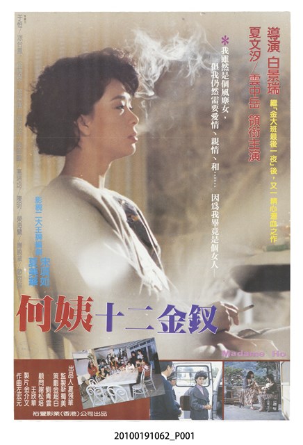1.臺港電影《何姨十二金釵》在臺上映宣傳中文彩色印刷海報,直式,雙面。海報主視覺為夏文汐身穿白色上衣,一頭短捲髮,面對右側版面抽煙,嘴巴吐出煙霧。下方放置三張電影劇照,右側為兩名女子坐在陽台對話,中間場景在車旁,駕駛座門打開,警察正與一名短捲髮女子對話;左側劇照框線較為傾斜,一長桌中許多女子聚在一起談笑。左下角橘色資訊版面註記演職員表;劇照右側直書主創人員,左側則有宣傳文案:「我雖然是個風塵女,但我仍然需要愛情、親情、和......因為我畢竟是個女人」,海報表面有些淺淺褪色,共有兩道明顯摺痕,一上ㄧ下,背面全白色,摺痕明顯。2.《何姨十二金釵》於1986年由裕豐影業(香港)公司出品,白景瑞執導,夏文汐、雲中岳主演。
