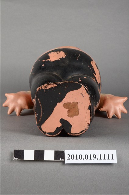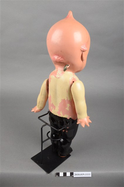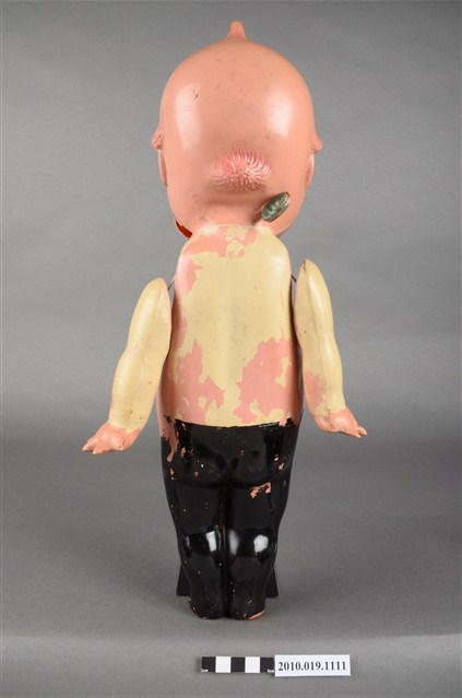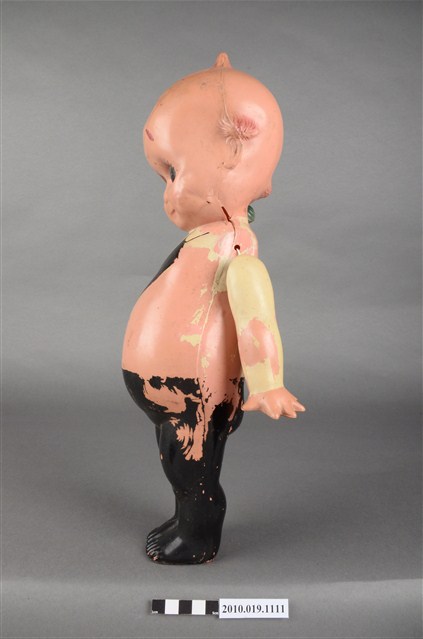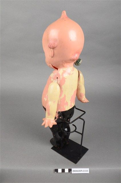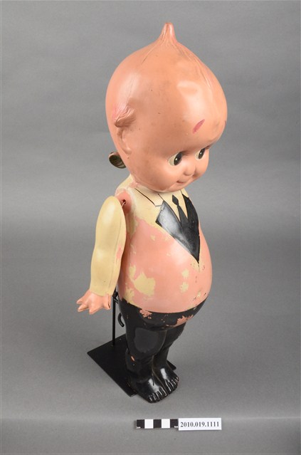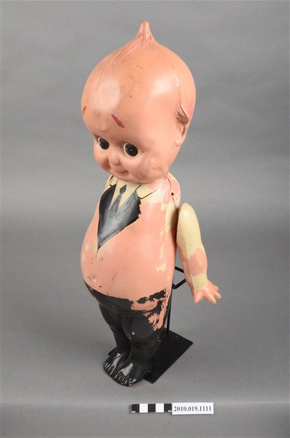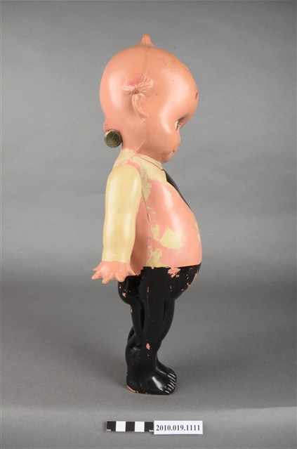 1.本物件為丘比玩偶,呈站姿,為黑色眼珠,雙手擺於大腿兩側,上半身畫有服務生制服與黑色長褲,身體部分呈現塗料脫落的情況。