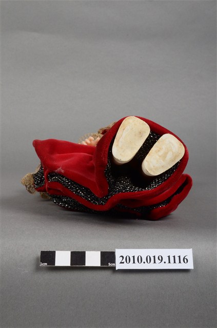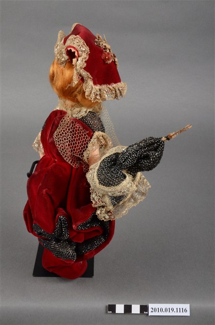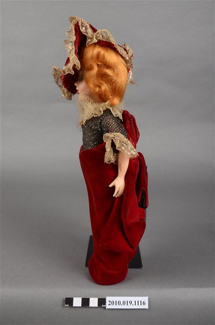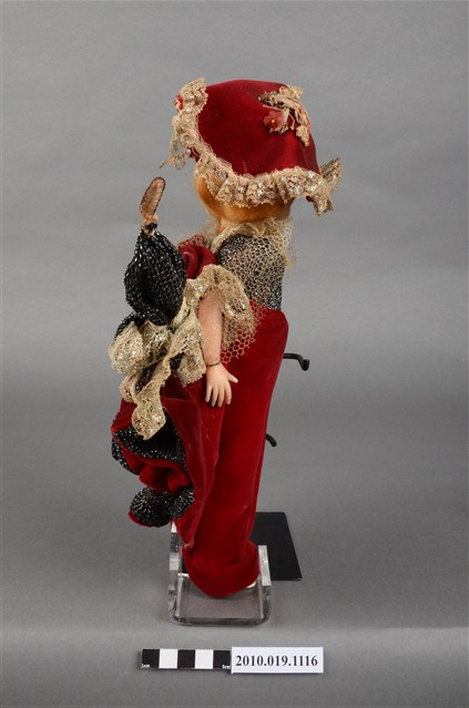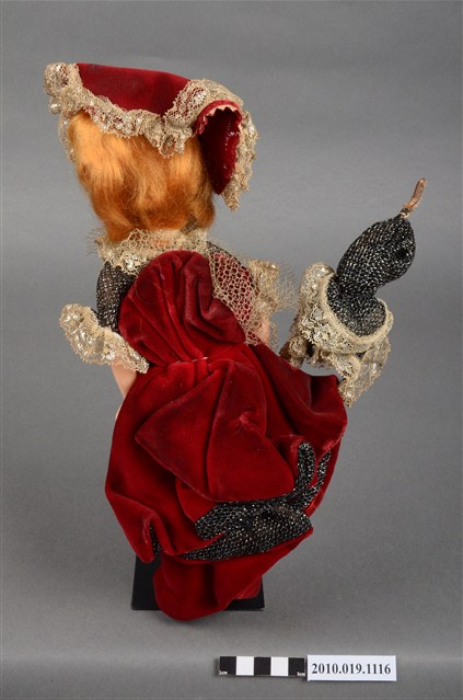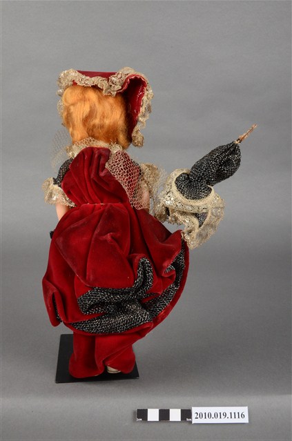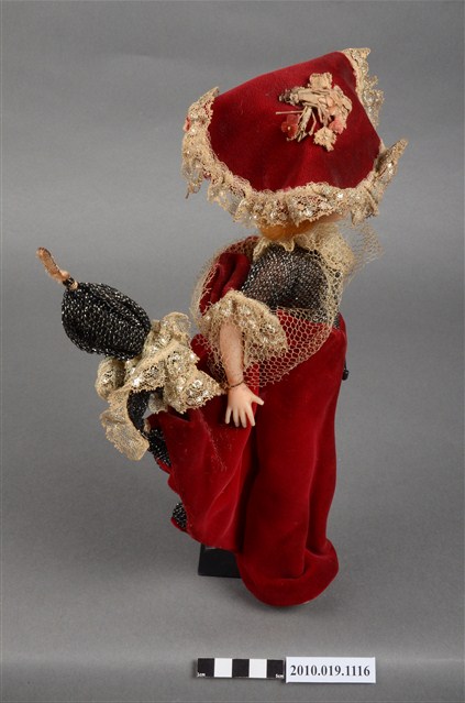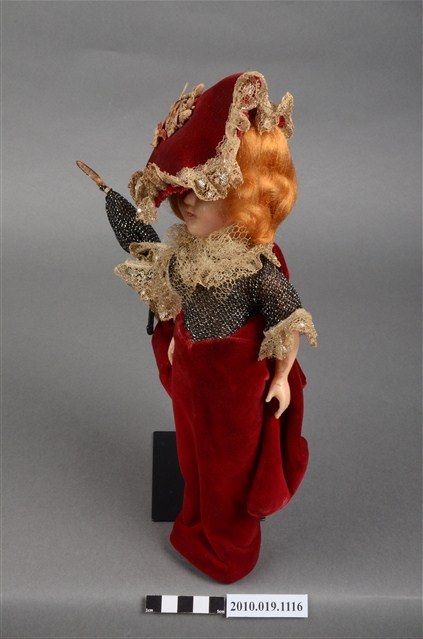 本物件為橘髮歐洲仕女玩偶,呈站姿,其頭戴紅色蕾絲帽,身著黑色蕾絲長袖上衣與紅色絨布洋裝,左後方則有黑色蕾絲雨傘。