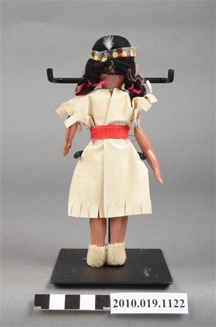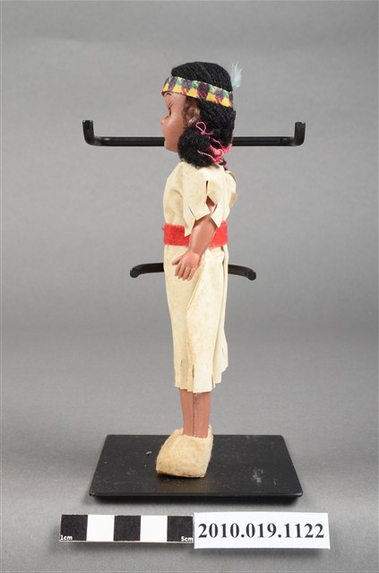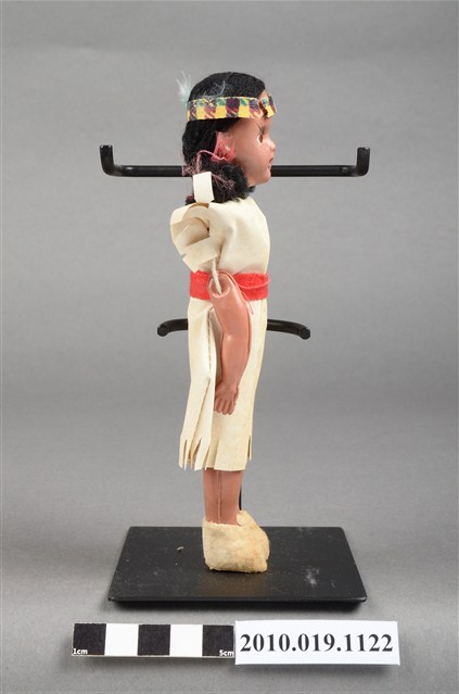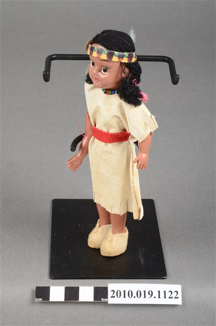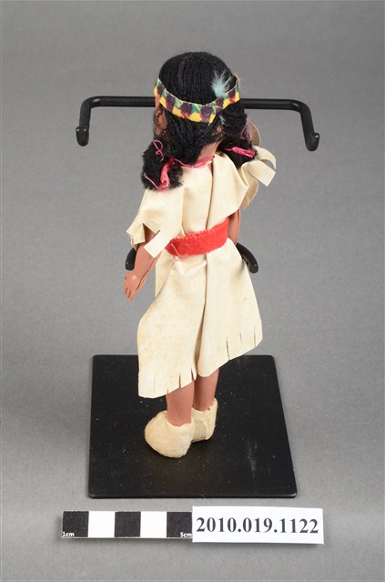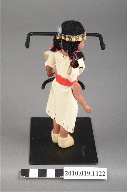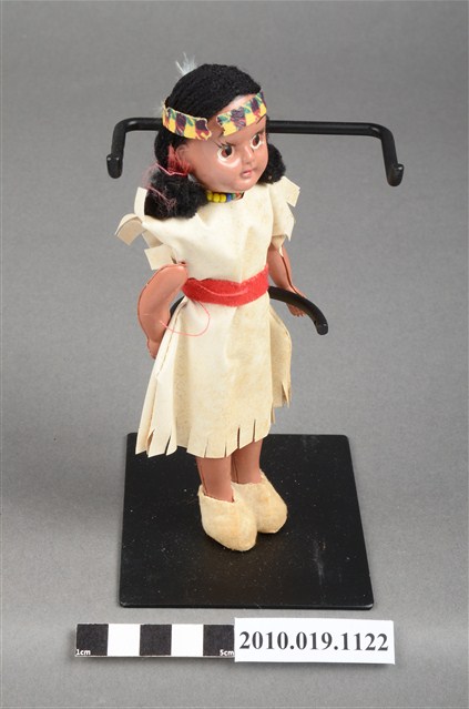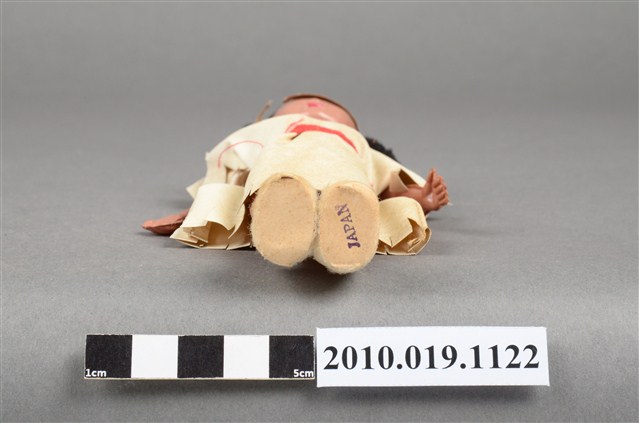 本物件為白色服飾女孩玩偶,頭戴紅色、綠色、黃色之印花頭巾,脖子戴有彩色串珠,深著米色連身裙,腰間綁有橘色綁帶,腳穿米色布套。右手呈現脫落狀態。腳底印有「JAPAN」字樣。