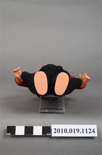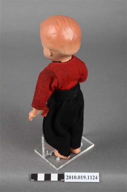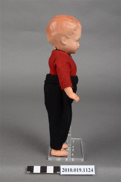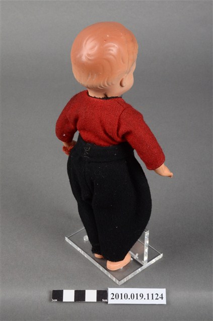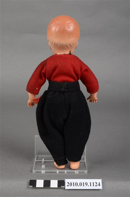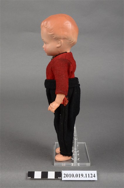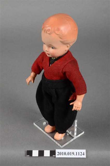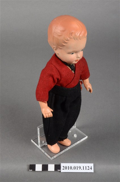 本物件為紅衣黑褲男孩玩偶,男孩為橘髮碧眼,呈赤腳站姿,身著紅色長袖開襟上衣與黑色高腰長褲且別有黑色領帶。