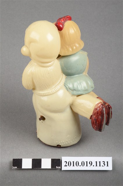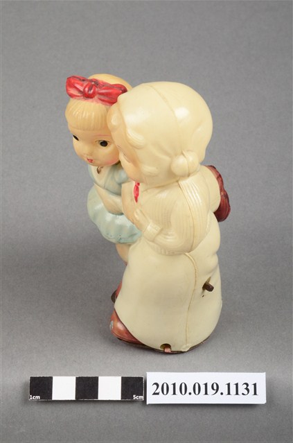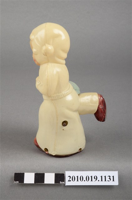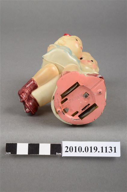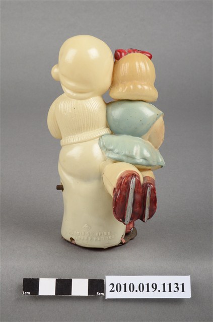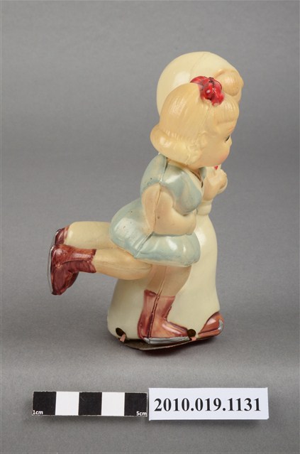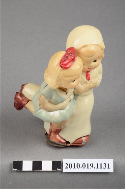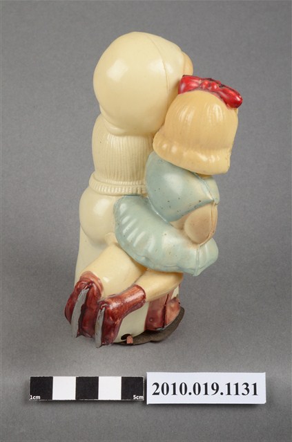 本物件為雙人溜冰發條玩偶,右為男孩左為女孩,皆腳穿溜冰鞋呈單腳站姿,雙手交握,男孩身著白色套裝繫紅色領帶頭戴白色頭套;女孩身著藍色短洋裝頭戴紅色蝴蝶結髮帶。底座有滑輪裝置,玩偶上印有「OCCUPIED JAPAN P PAT 1983」製造資訊。