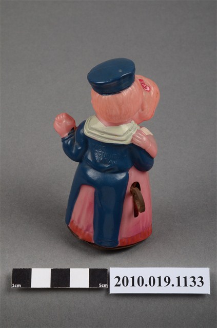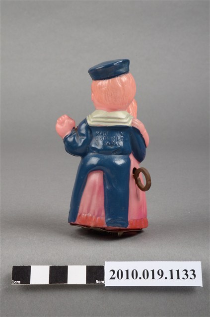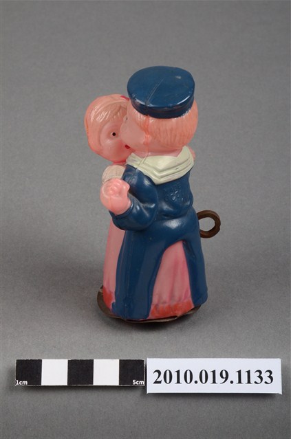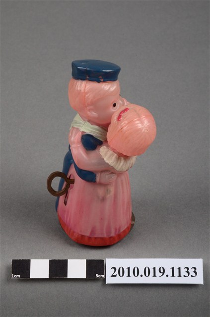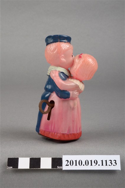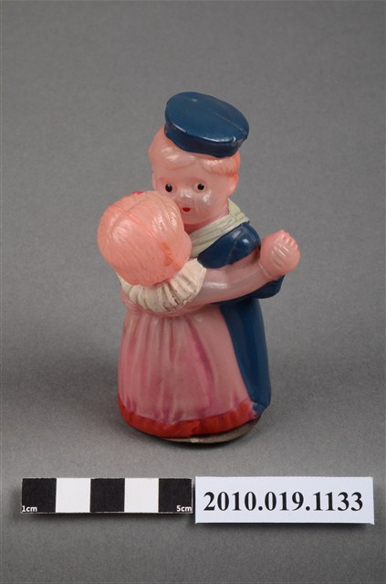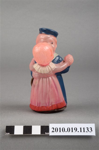 本物件為雙人舞發條玩偶,為男女相擁的姿勢,右方男孩著藍色水手服套裝與頭戴藍色圓帽;左方女孩身著粉紅色長洋裝。底座有滑輪裝置,玩偶上印有「MADE IN OCCUPIED JAPAN」製造資訊。