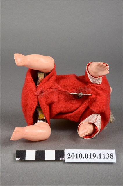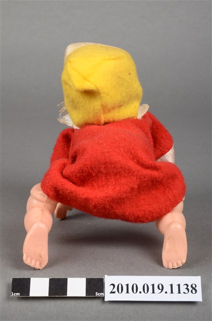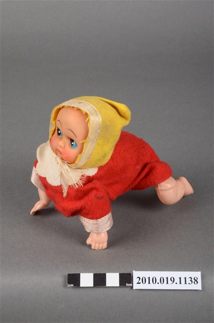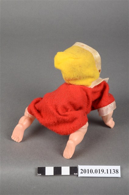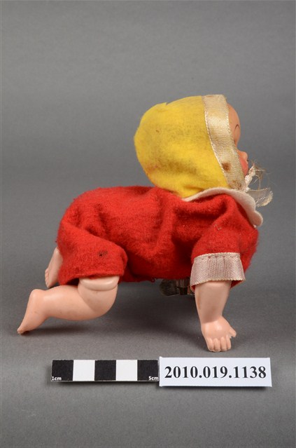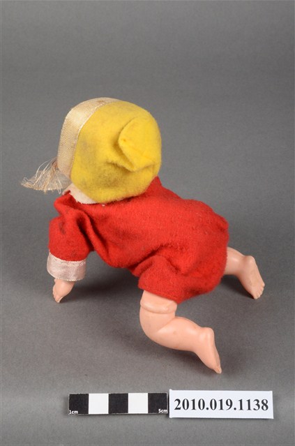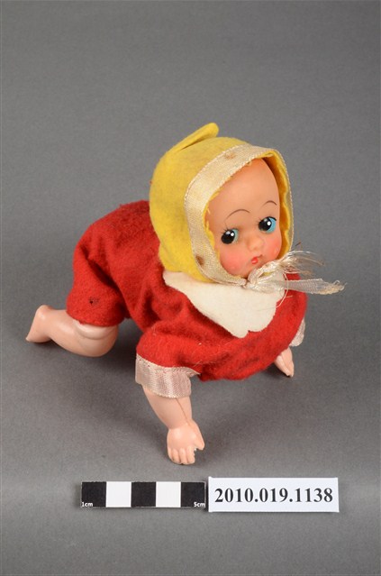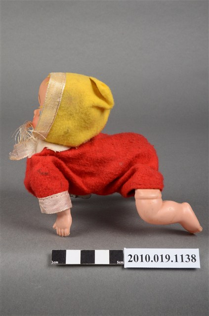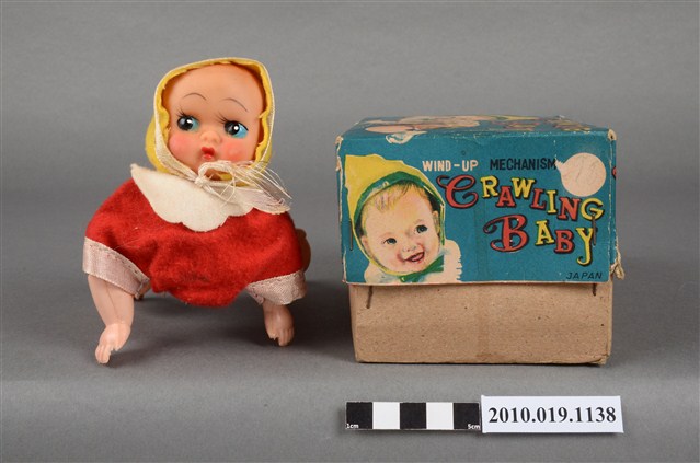 本物件為爬行嬰兒發條玩偶,黑藍色眼睛,嘴巴塗有口紅,呈爬行姿勢,身穿紅衣,頭披黃色頭巾,嬰兒腹部位置有金屬發條,玩偶外盒為藍色,寫有「WIND-UP」、「MECHANISM」、「ERAWLING BABY」、「JAPAN」等字樣,以及戴黃色帽子的嬰兒圖樣。