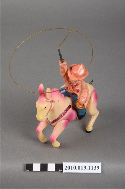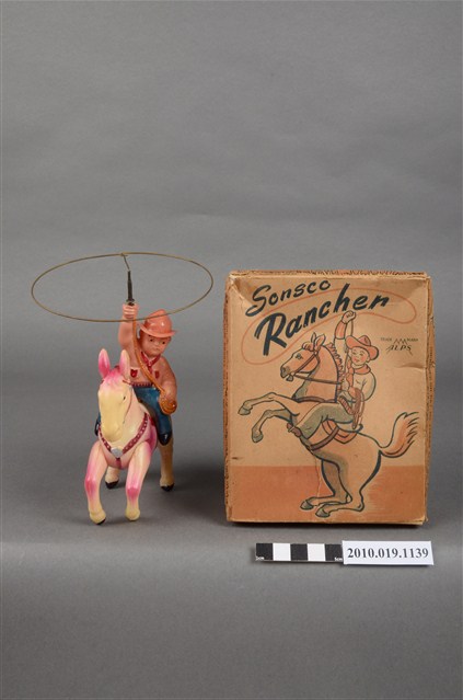 本物件為牛仔騎馬發條玩具,身著紅色領結之粉橘色襯衫與藍色長褲之牛仔,手持繩索套,繩索套為金色金屬材質,騎在粉色馬匹上,馬匹後方有斷裂的金屬發條,玩具外盒為咖啡色,寫有「Sonsco Ranchen」、「TRADE MARK ALPS」等字樣,以及牛仔騎馬圖樣。