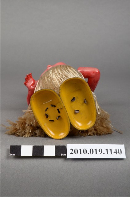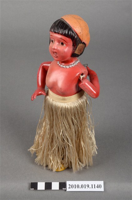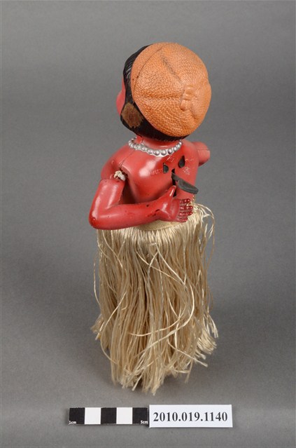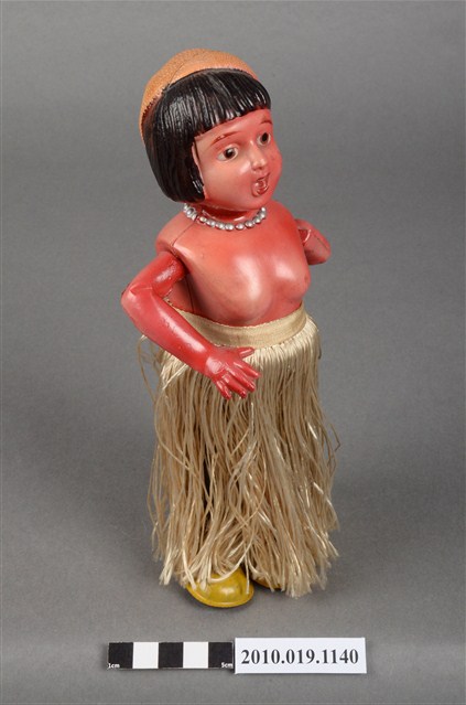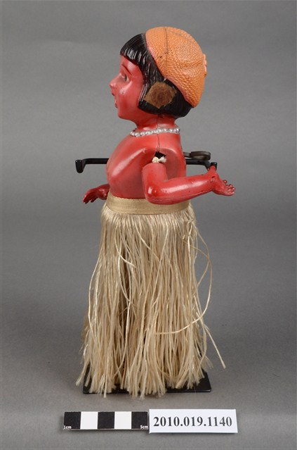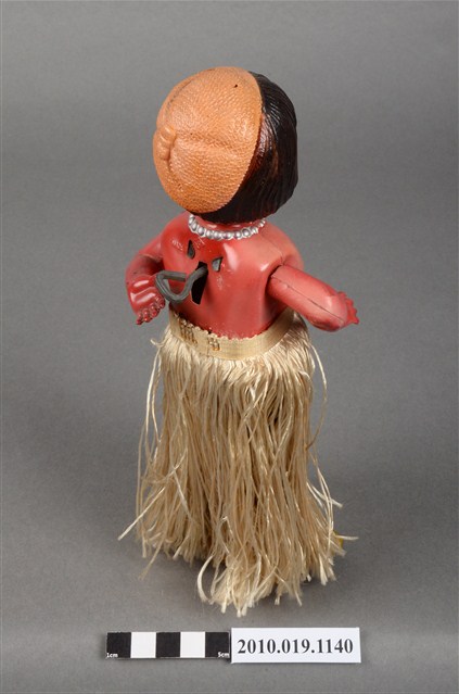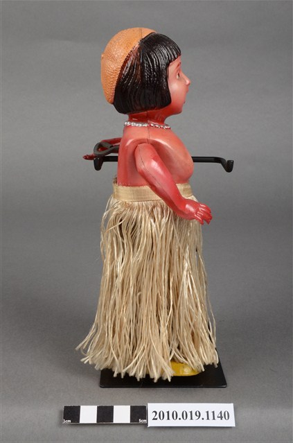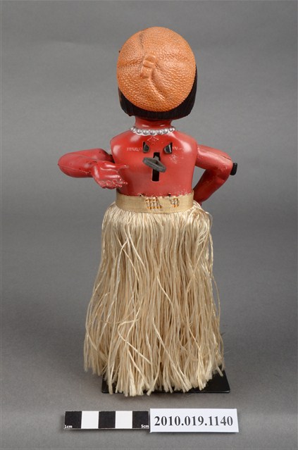 1.本物件為草裙舞女孩發條玩偶,女孩正面為棕髮棕眼,呈站姿,上身赤裸,下身著金色草裙舞,頭戴橘色貝蕾帽。背面中央有金屬發條。