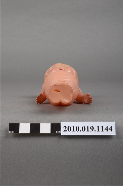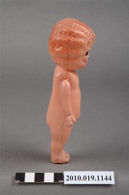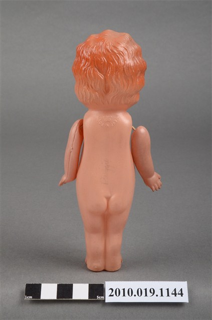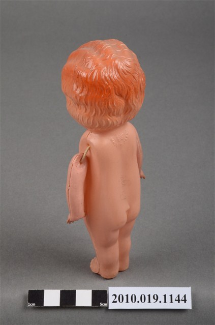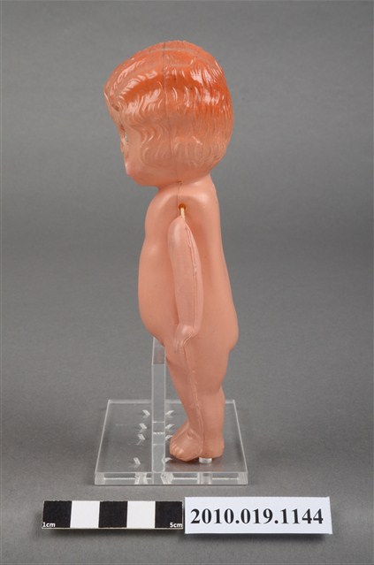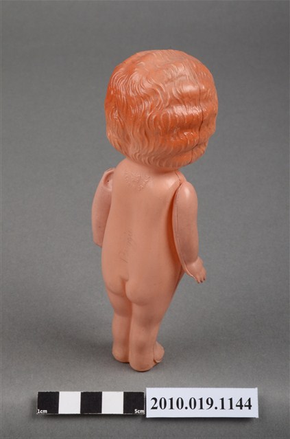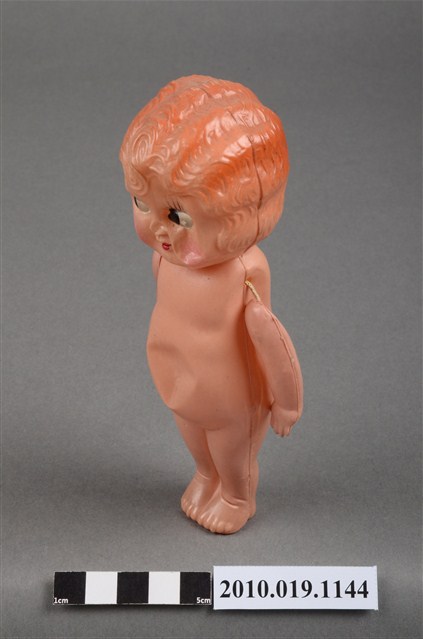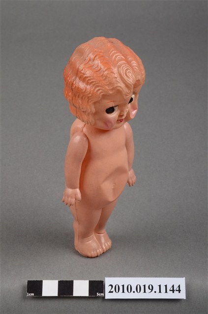本物件為黑眼女孩玩偶,呈站姿,黑色眼睛與眉毛,嘴巴塗有口紅,身體未穿著衣服,臉頰與肚子呈現凹陷模樣,右手有脫落狀況,腳底部有破損狀況,底部印有「MADE IN JAPAN」字樣。