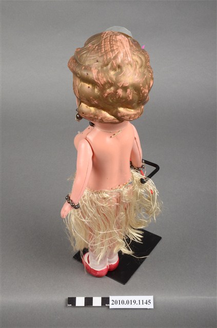 1.本物件為草裙舞女孩發條玩偶,女孩為金髮藍眼,呈站姿,上身塗有白色顏料遮掩胸前,下身著金色草裙舞,頭戴銀色禮帽遮住右眼,脖子戴黑色項鍊,耳朵戴黑色墜飾,雙手戴有黑色手環,手持紅色拐杖,腳畫有白色長襪與紅色皮鞋。