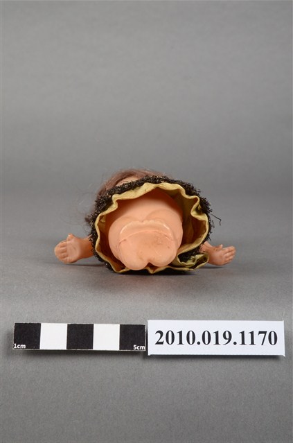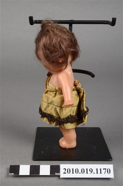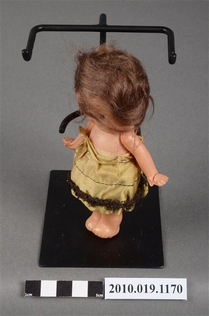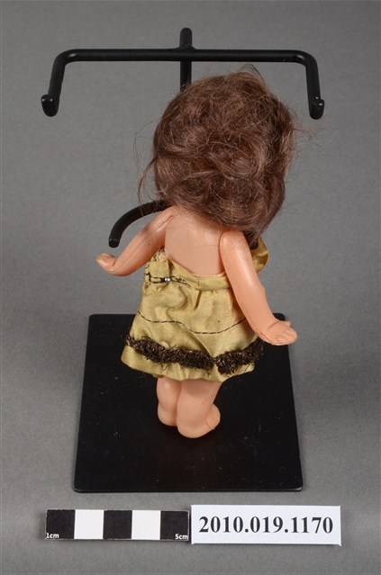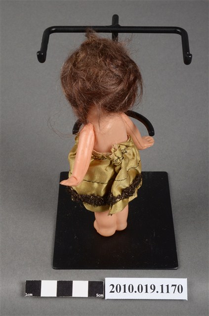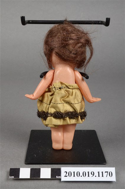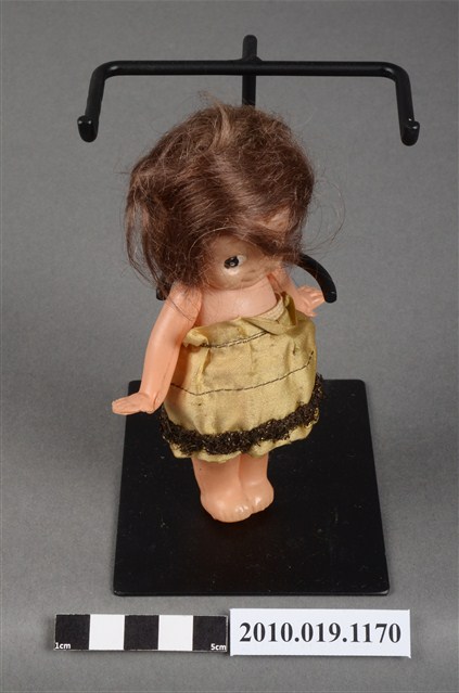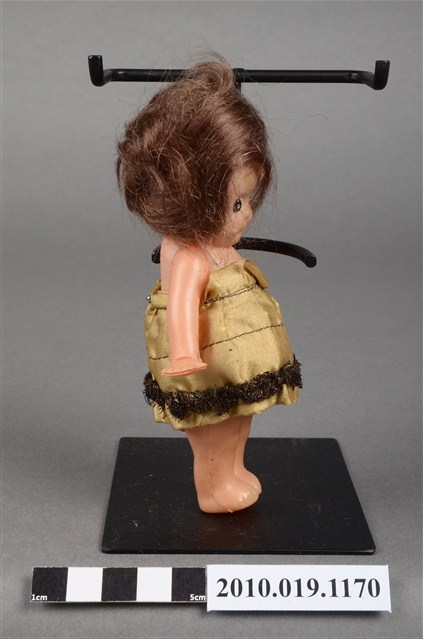 本物件為棕髮女孩玩偶,為金色波浪短髮,棕色眼睛與眉毛,嘴巴塗有口紅,雙手微開呈站姿,其身著縫有黑色絨布式樣之卡其色短洋裝。