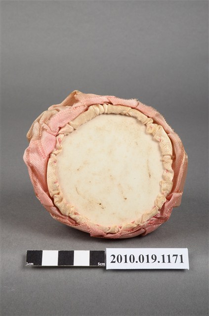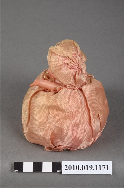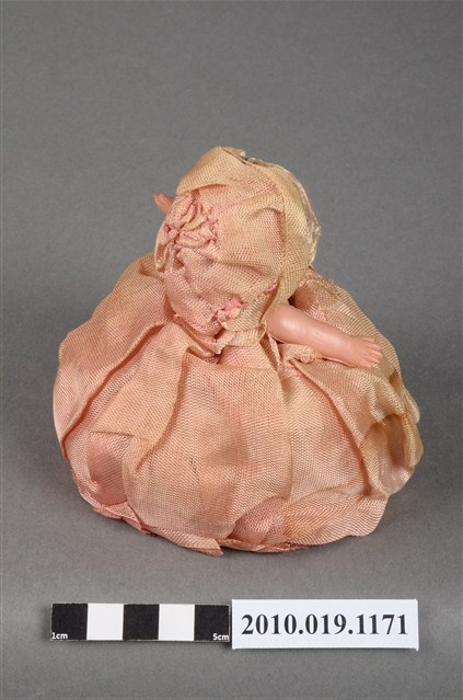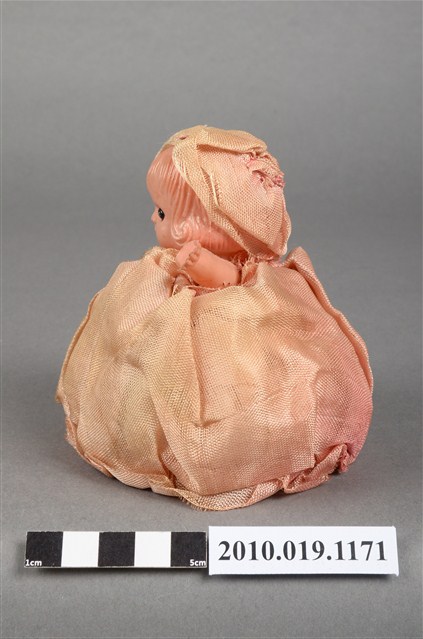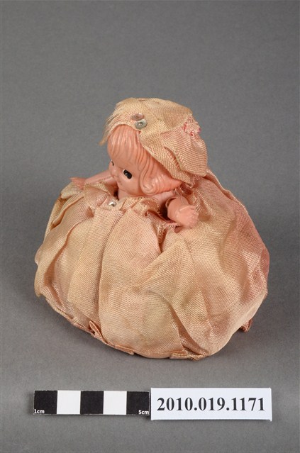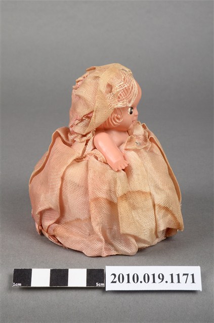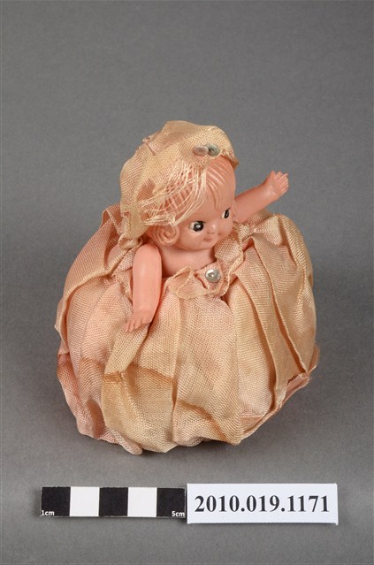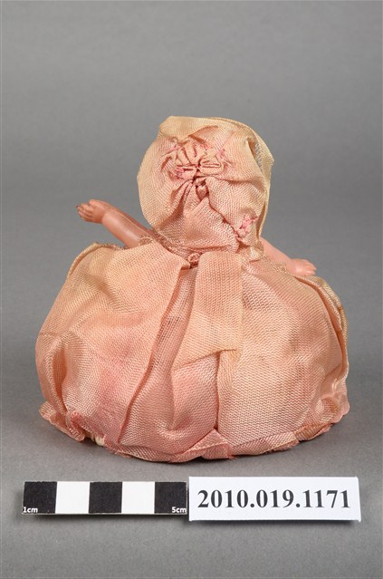 本物件為米色澎裙女孩玩偶,為粉色短捲髮與黑色眼珠,雙手打開右上左下呈站姿,其身著繡有銀色飾品之米色皺褶澎裙且頭戴頭紗。