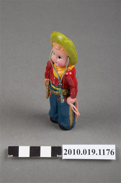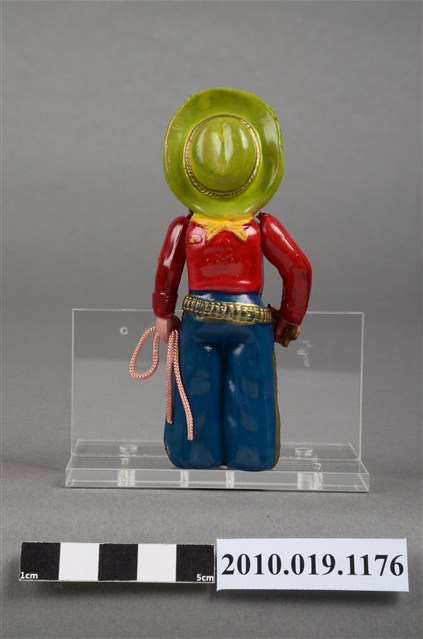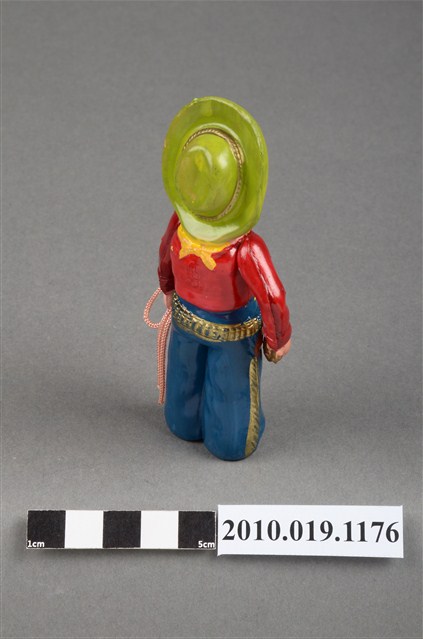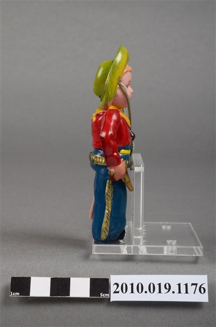 本物件為金髮女牛仔玩偶,右手持有金色手槍,左手拿有米色繩索,呈站姿,其身著紅色長袖襯衫與藍色長褲,頭戴附有藍色掛繩之黃邊綠色牛仔帽,肩披黃色領巾,腰間繫有黃色皮帶與子彈匣,腳穿黑色鞋履。