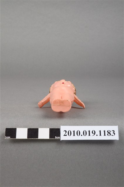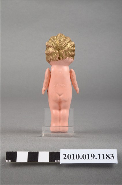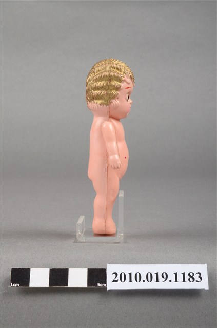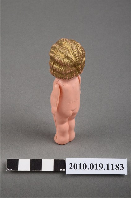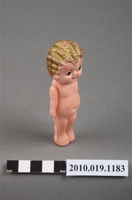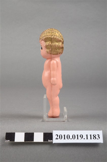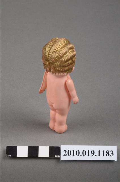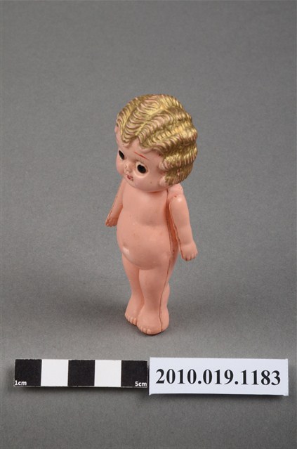 本物件為金色捲髮嬰兒玩偶,呈站姿,其為金色波浪短捲髮,黑色呈現眼睛,嘴巴塗有口紅,身體未著衣服,雙手垂放於雙腿兩側,雙手有些微鬆脫,身體有部分污漬及殘缺。