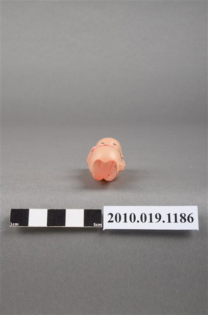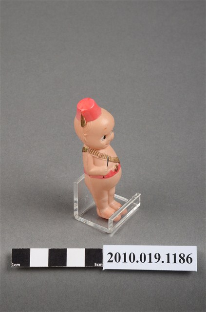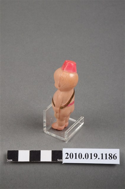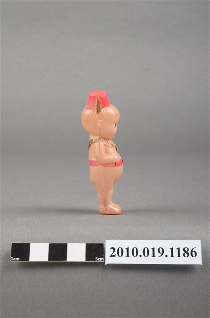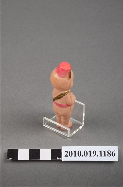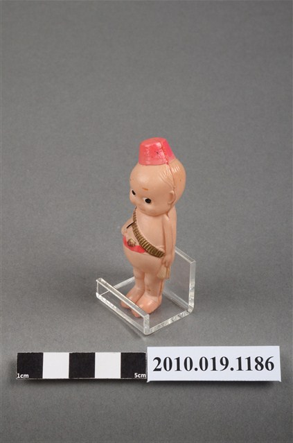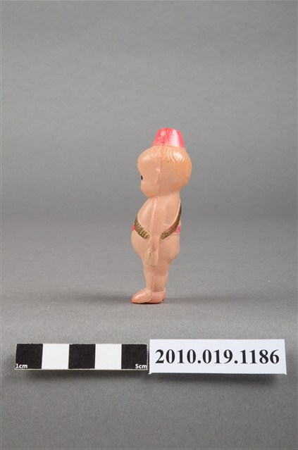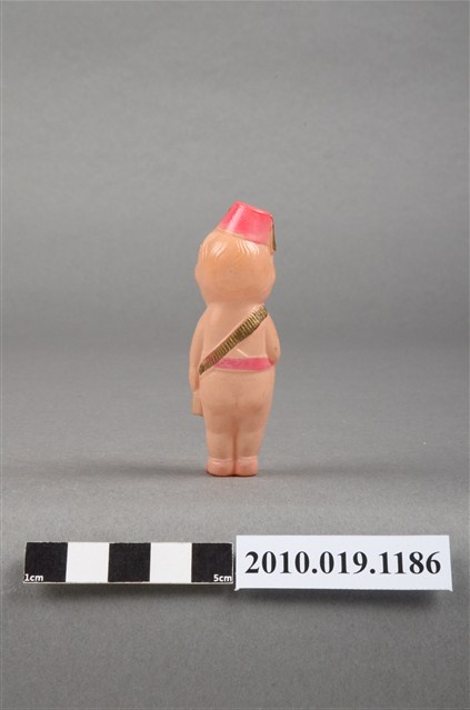 本物件為軍人造型玩偶,為嬰孩樣貌,頭上戴著紅色軍帽,身上背著金色肩背帶,穿戴金紅相間的腰帶。背面寫有製造地,但磨損嚴重無法辨識。