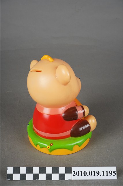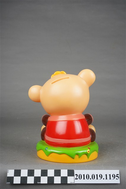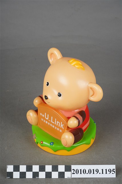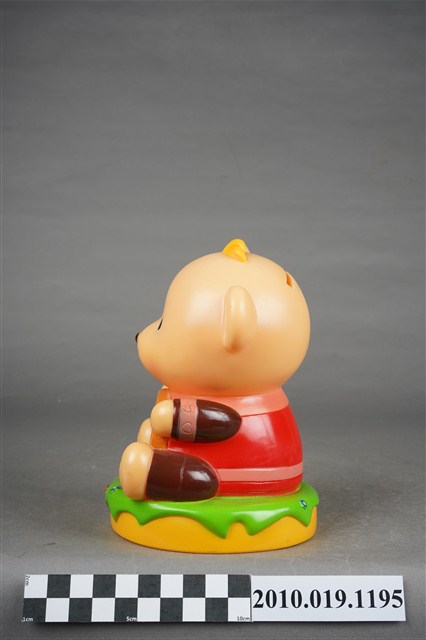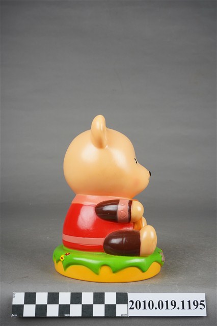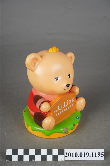 1.本物件為英國保誠人壽小熊造型存錢筒,米色小熊身穿紅色衣服,手臂、腿部為棕色,正面有寫著保誠人壽廣告詞牌子。