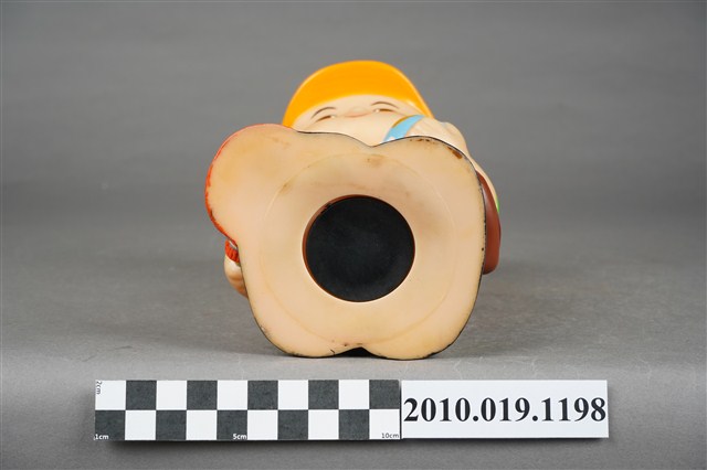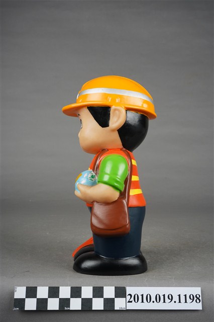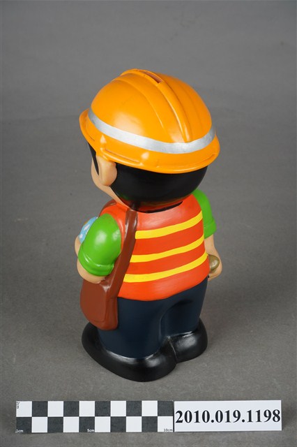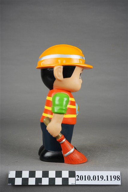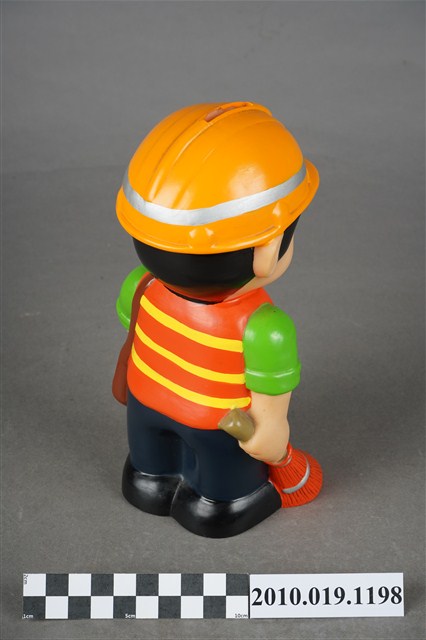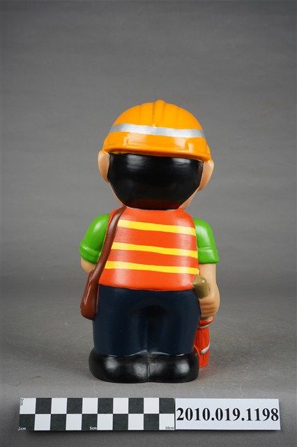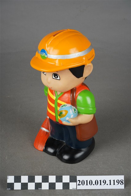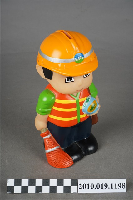 1.本物件為環保署清潔隊造型存錢筒。頭戴環保署標誌橘色頭盔、身穿橘黃相間反光背心、綠色上衣、以及深藍色褲子,腳穿黑色鞋,右手持掃把,肩背側背包。