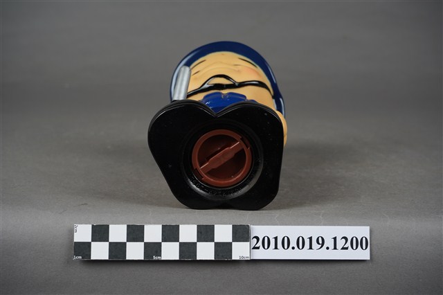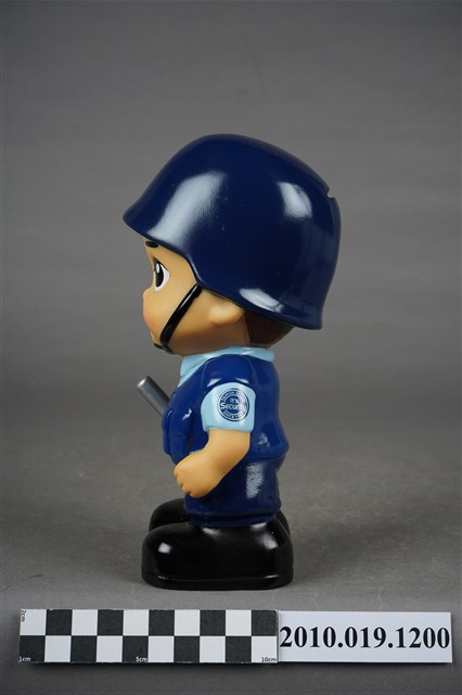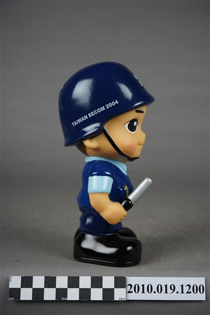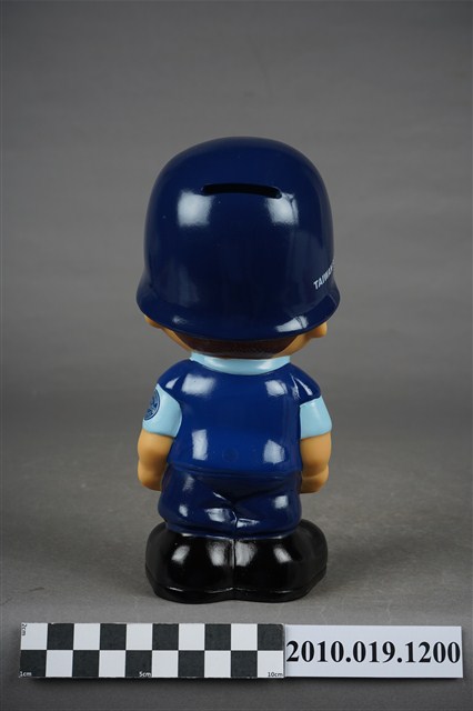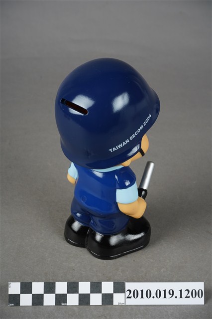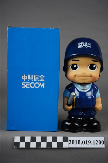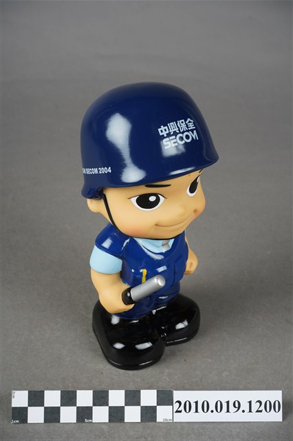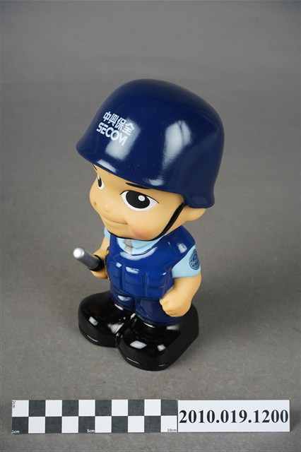 1.本物件為中興保全警衛造型存錢筒。頭戴深藍色頭盔,上有「中興保全」商標,身穿淺藍色短袖上衣,左手袖子上有「TAIWAN SECOM」、「It's Security」、「SINCE 1997」等字組成之圓形標誌,以及身著深藍色背心、長褲、黑色鞋子,右手持警棍。