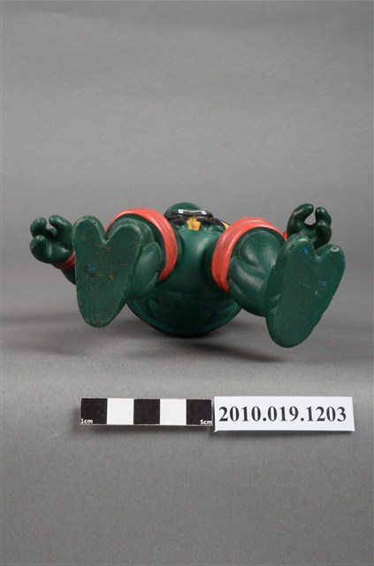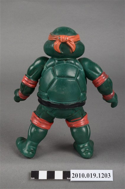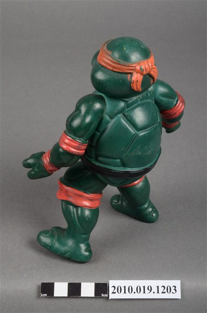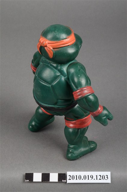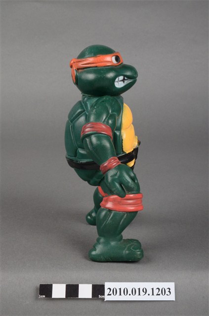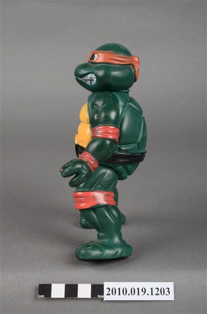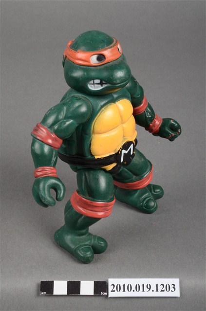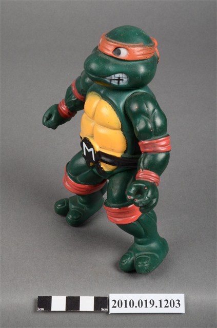 1.本物件為忍者龜米開朗基羅玩偶,是依照忍者龜漫畫圖像設計的立體模型,該漫畫的主角之一米開朗基羅帶著橘色眼罩、黑色腰帶,咬著嘴唇的樣貌。