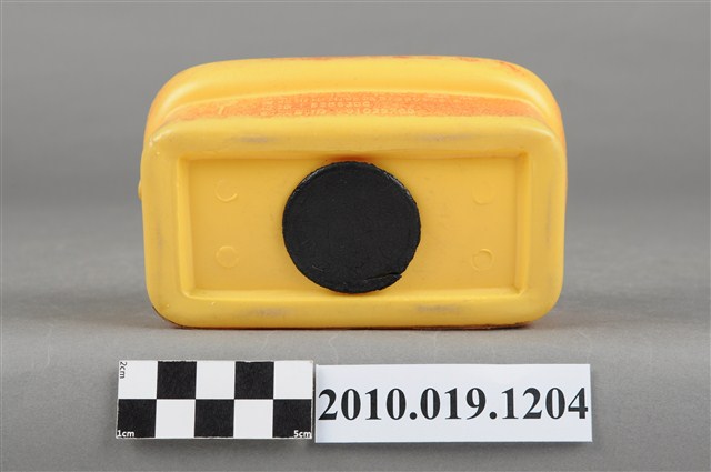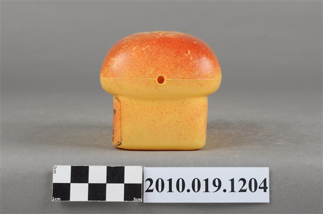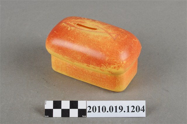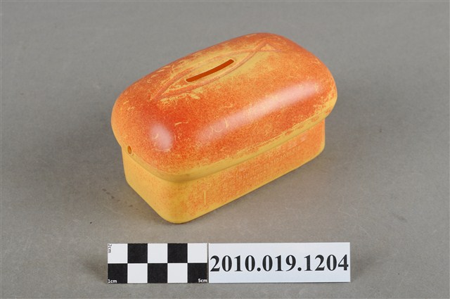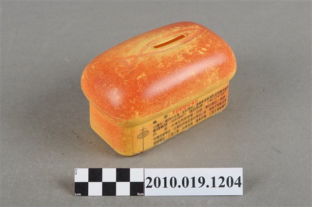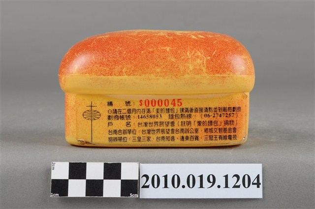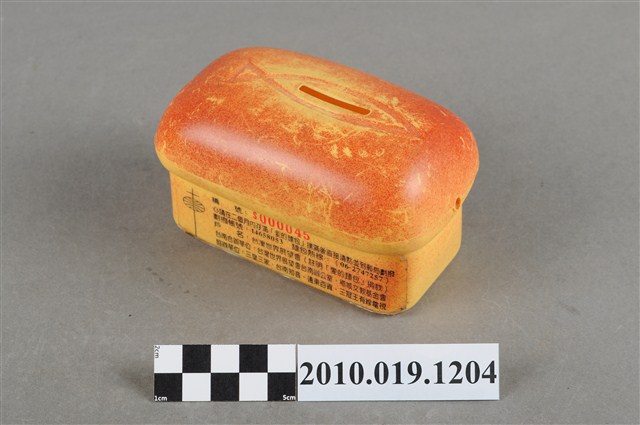 1.本物件為臺灣世界展望會「愛的麵包」存錢筒。存錢筒兩側分別有「臺灣世界展望會」的聯絡方式與劃撥帳號,以及「愛的麵包」捐款活動方式與贊助廠商等資訊。